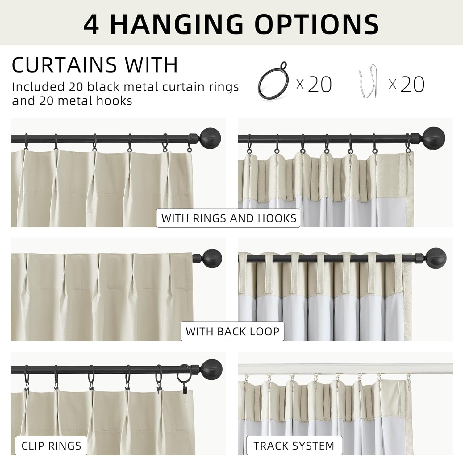Multiple Hanging Ways:Pinch Pleat,hooks,Rod Tabs,Clip Rings.4 Hanging options to meet your different home decor need.
