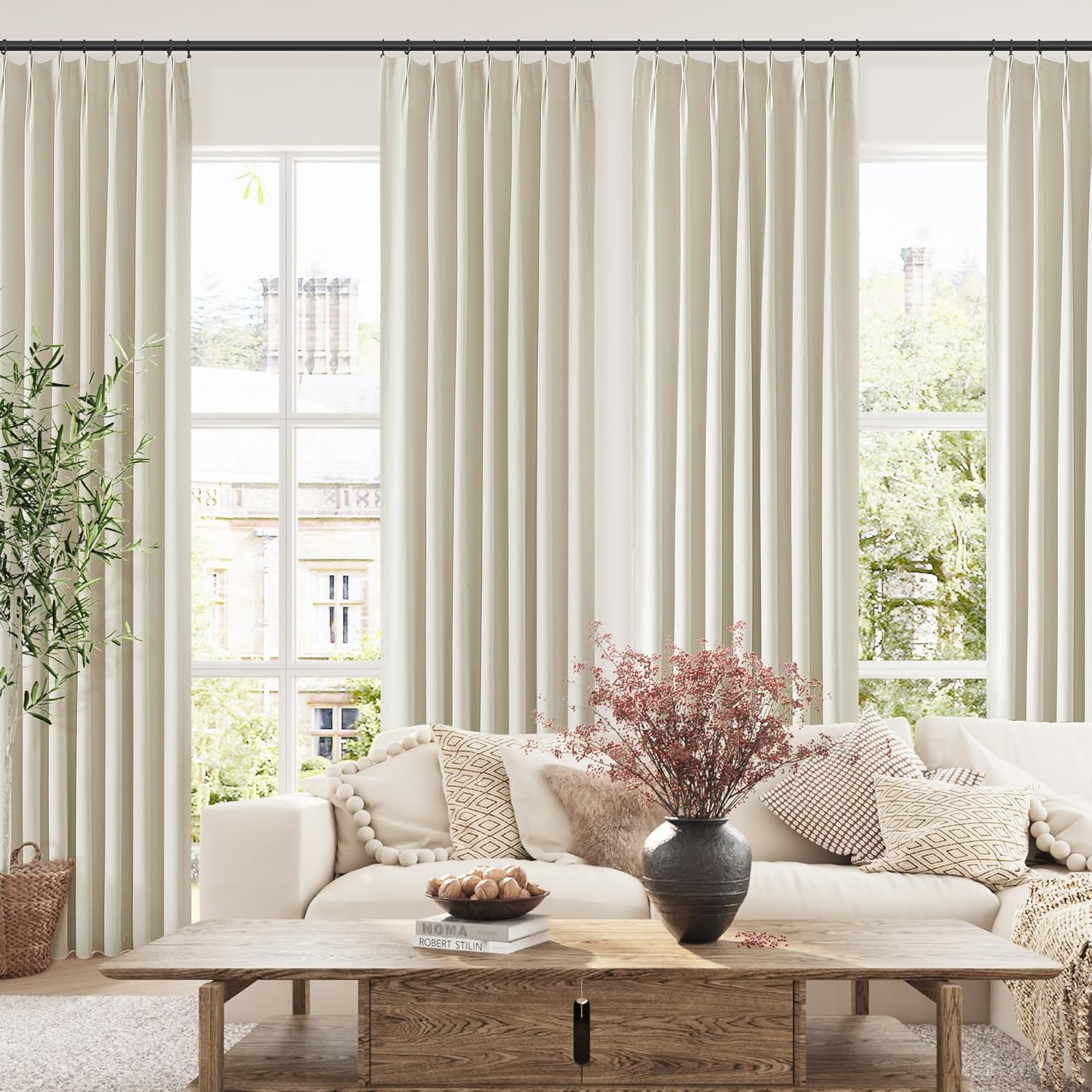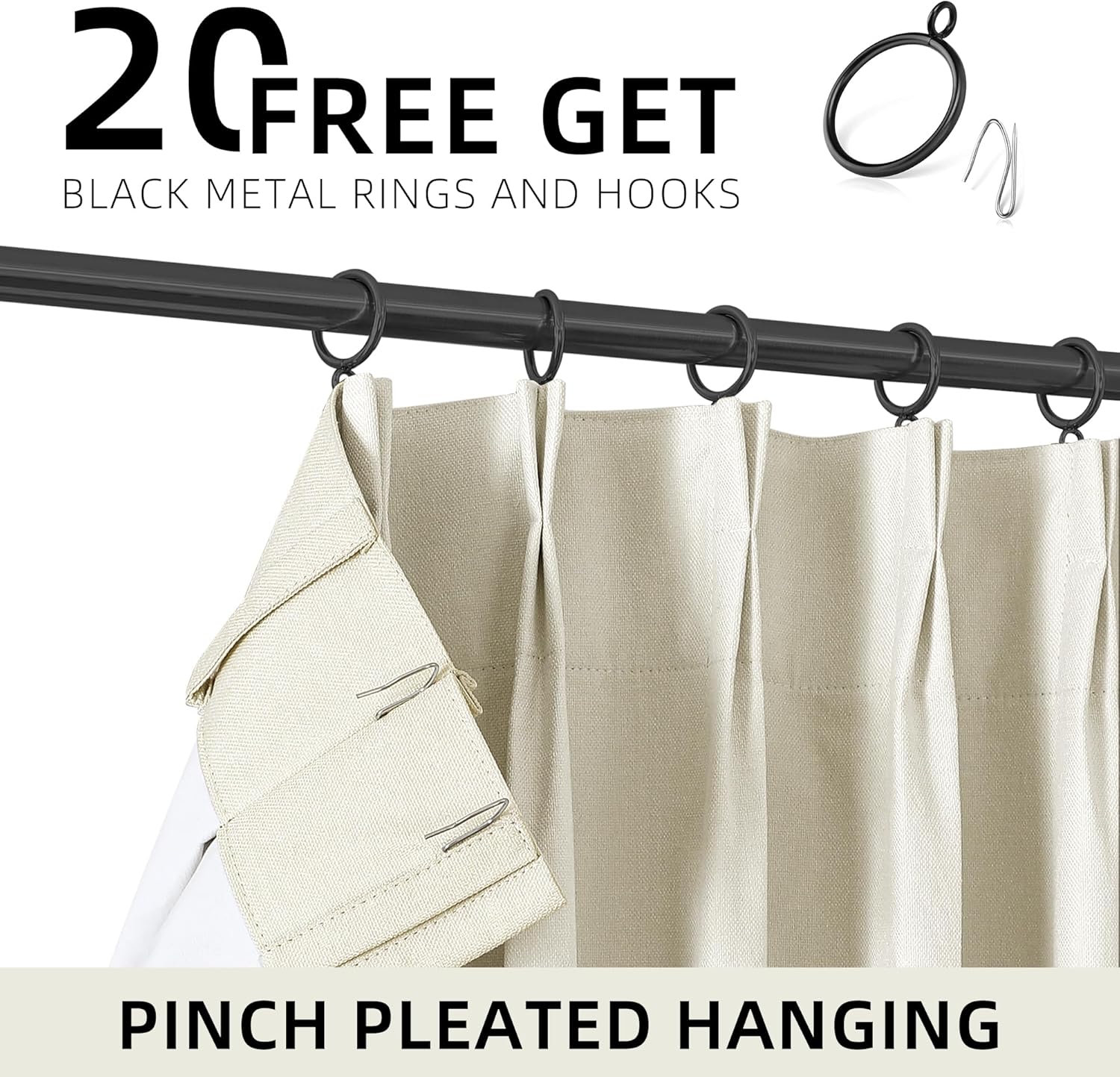 Natural Linen Texture & Pinch Pleats:Linen blend fabric with permanent pinch pleats for structured folds.Timeless farmhouse elegance with natural drape.