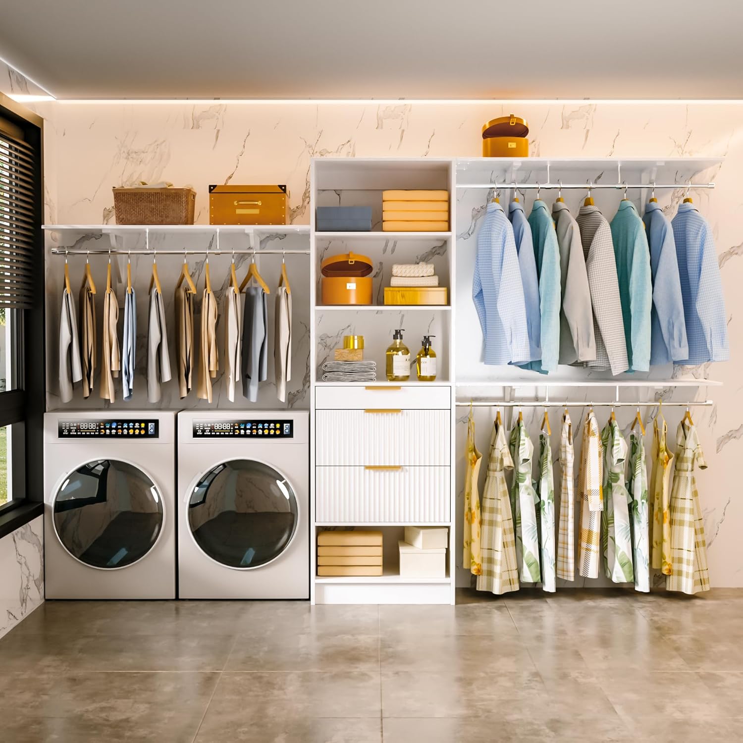 Customizable and Flexible Walk-in Closet: With 3 expandable hanging rods, you can easily create a personalized walk-in closet system tailored to your space. It can fit the 5 feet to 8 feet wide closets (the shelving towers can be cut to fit), and the hanging rods can expand from 22 inches to 39 inches. You can cut down components for tighter spaces or combine multiple units to expand your storage capabilities, making it suitable for both walk-in closet systems and built-in closet organizers.