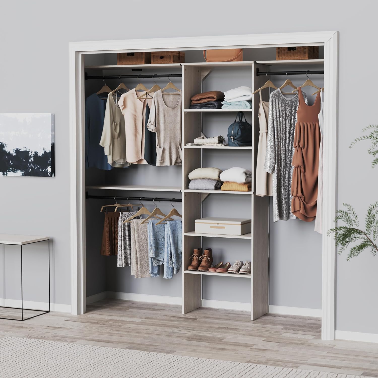 ClosetMaid SuiteSymphony 25-Inch Closet System Tower with (3) Hanging Rods, and (3) Top Shelves, White Timber. Closet organization doesn’t have to be unsightly thanks to the luxe and refined look of the SuiteSymphony tower in white timber. This storage tower offers ample space to hang clothes, tuck away accessories, or even display items like purses. This kit is comprised of 3 hanging rods and 3 top shelves. The unit comes with black hardware for a polished look that contrasts against the light grain wood. It’s easy to design and install this beautiful storage and organization system in your home. This storage solution can be modified to your changing needs and customized to organize your clothing and accessories in a way that fits your lifestyle. SuiteSymphony was made to be adjustable and is the ideal way to store your clothing, shoes, accessories, and more. Begin with one of our Organizer Kits in multiple wood-grain finishes. Then simply add other units and accessories to meet your needs. Affordable storage that fits your life.