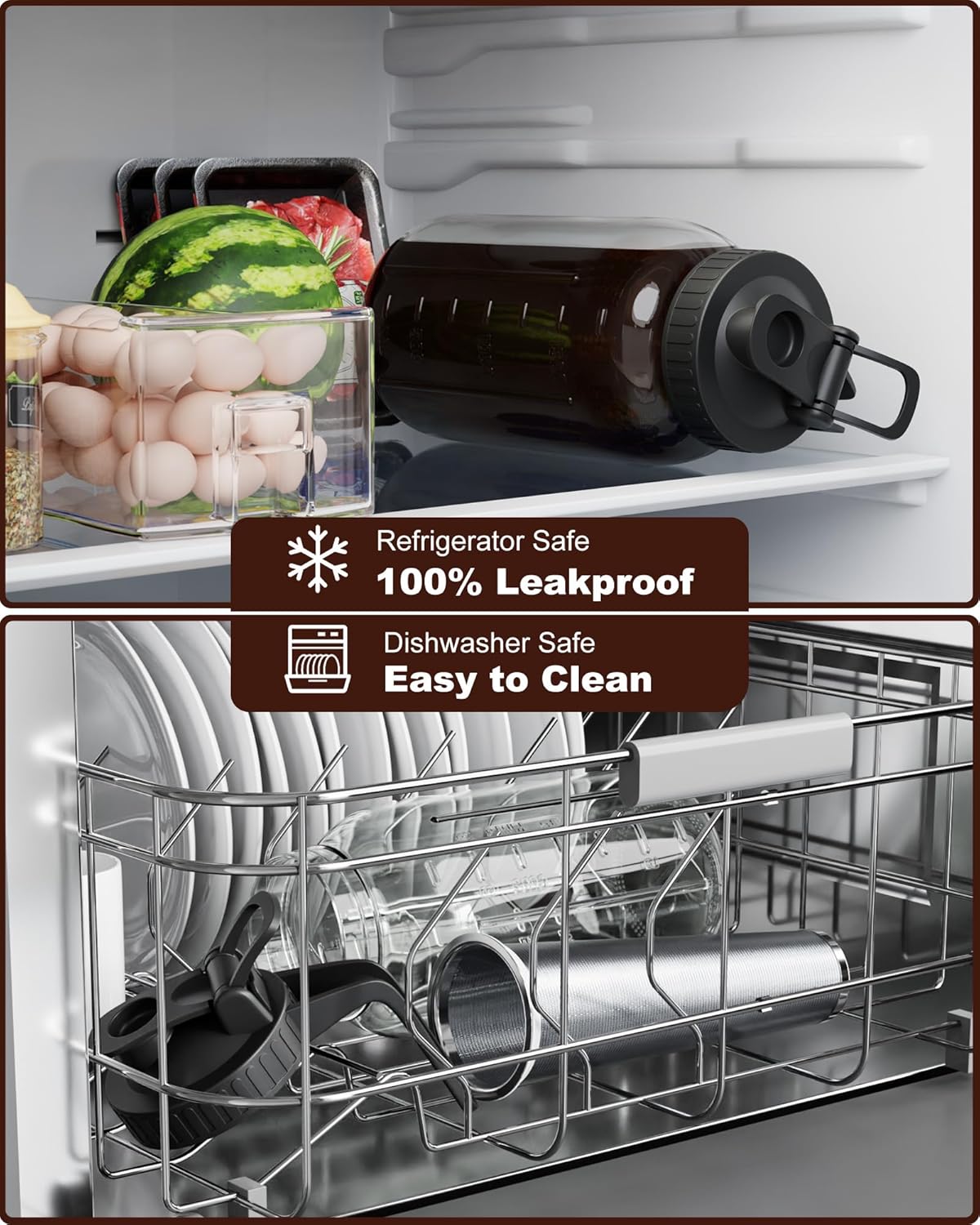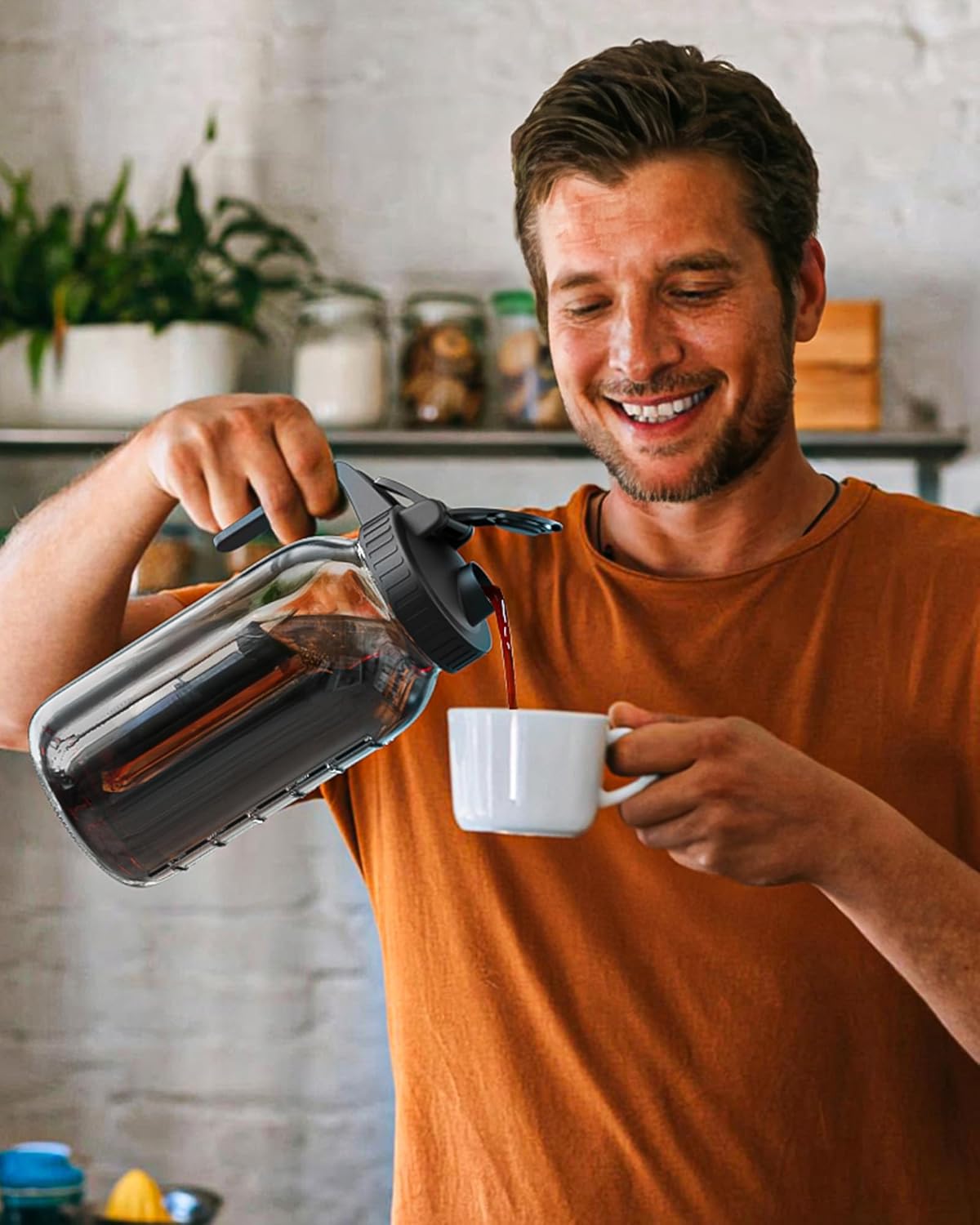PREMIUM AIRTIGHTNESS: The 64oz cold brew pitcher pot comes with a silicone seal on the lid for premium airtightness, keeping your drinks fresh while also preventing leaks,even when the bottle is placed upside down or shaken.It’s easy and convenient to open, pour and close,so you can store your drinks with confidence