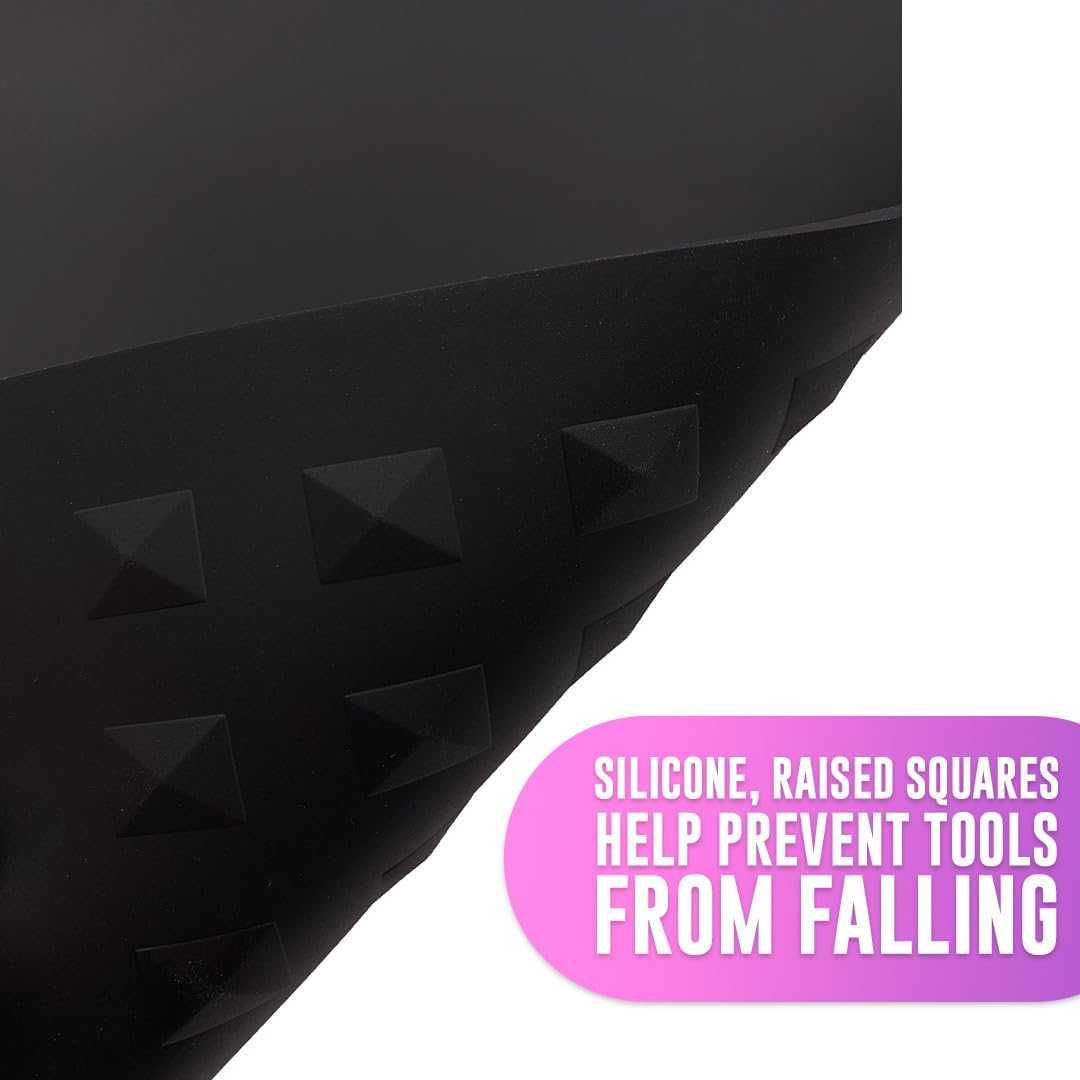 PREVENTS TOOL SLIPS AND FALLS: While the thick silicone forms a safe barrier between hot tools and work surfaces, the raised square design also provides no-slip grip and traction to help prevent heated irons, shears, color bowls and other tools from spilling or falling off your styling station.