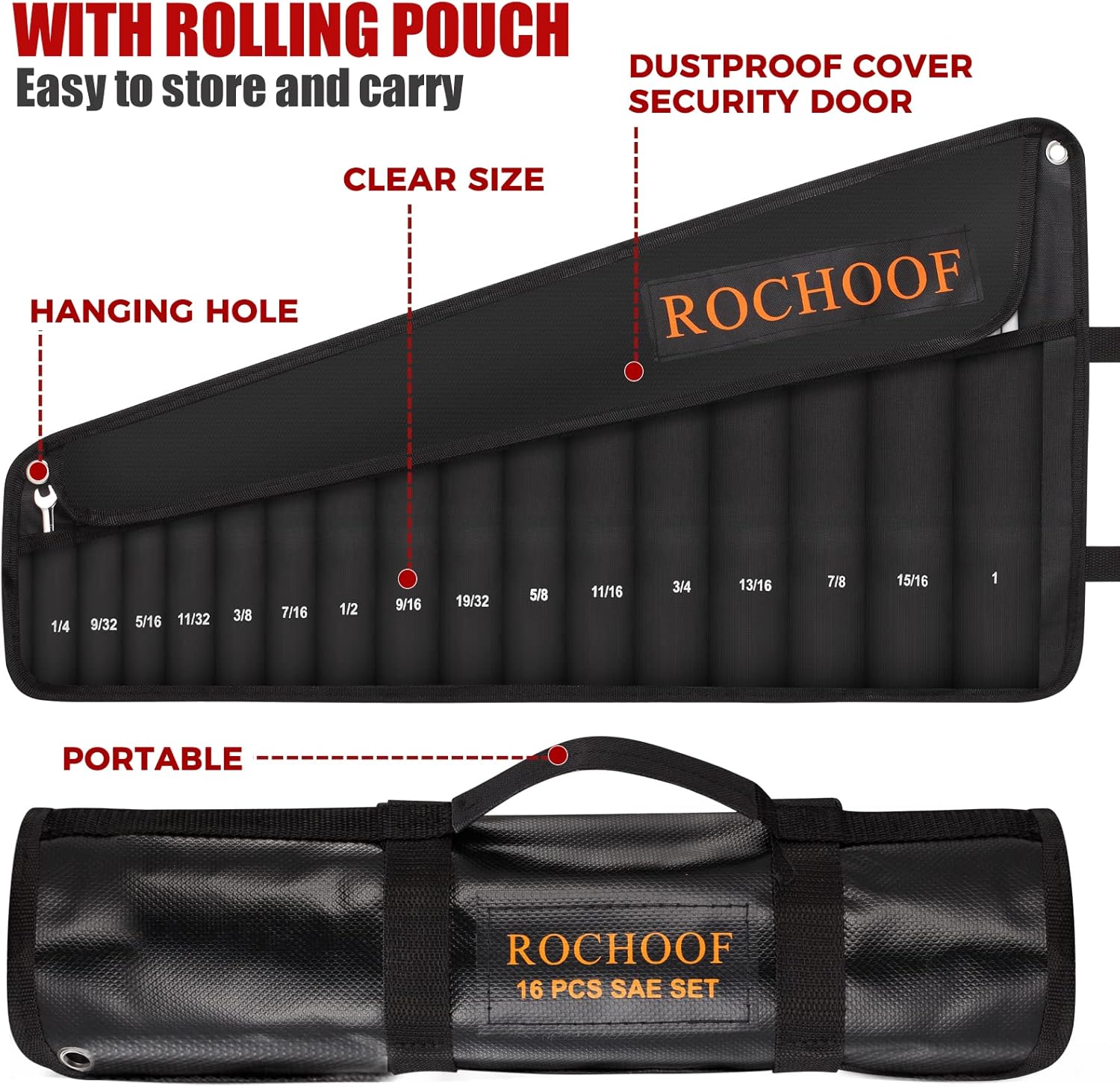 【EXCELLENT MATERIAL】: ROCHOOF combination wrenches are made of heat-treated chrome vanadium steel, which is stronger and more durable, not easy to wear. Surface mirror chrome plating, anti-rust and anti-corrosion. Extend service life. Meets and exceeds ANSI standards.