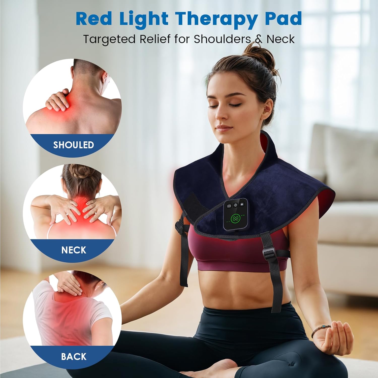 Infrared and Red Light Therapy for Neck & Shoulders: Equipped with 120 high-intensity LEDs, emitting 660nm red light and 850nm near-infrared light. This therapy pad penetrates deep into tissues to promote blood circulation, boost metabolism, enhance cell vitality, and relieve neck, shoulder, and back pain.