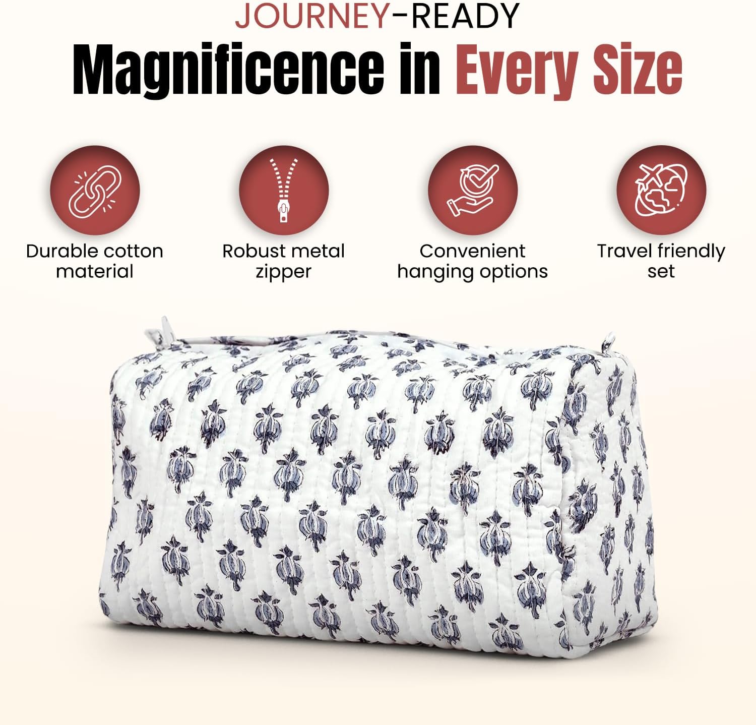 Cotton Hand Block Floral Print Toiletry Bag For Women Make Up Cosmetic Bag Jewelry Organizer Kit Storage Case Travel Accessories Essential Toiletries Purse Pouch (White – Small Medium Large, Set of 3)