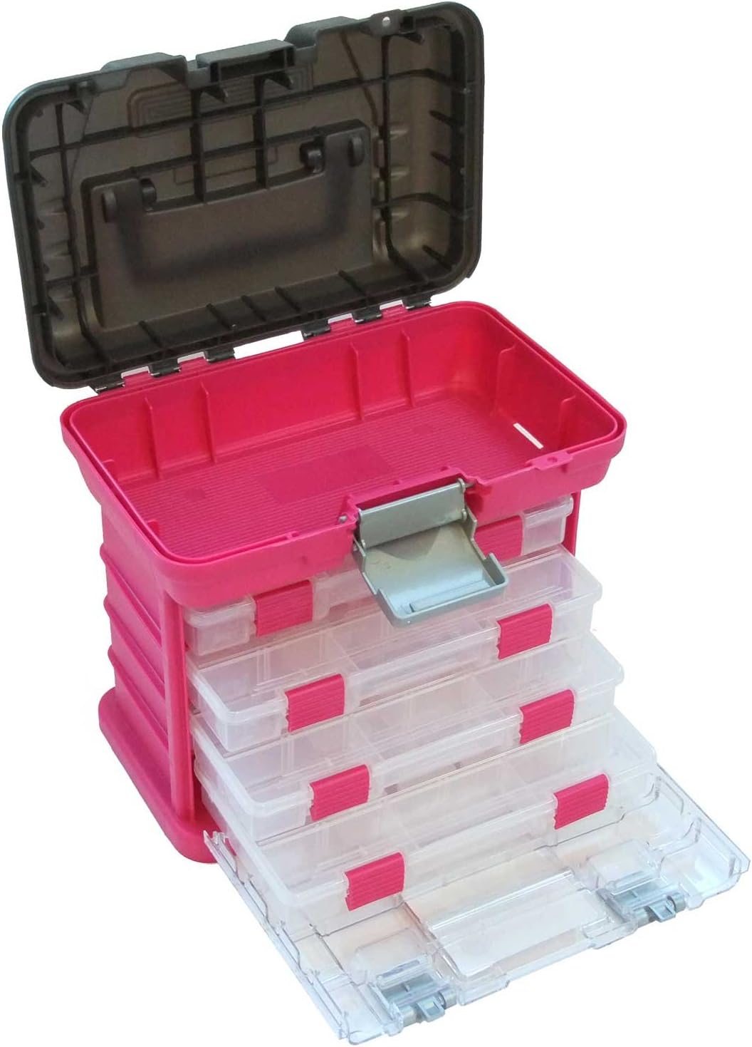 The Grab’n’Go Rack System by Creative Options combines drawer organization with utility boxes to give crafters and artists an organizational option for any craft hobby. The top of the kit features a large bulk storage area for larger items, while the acrylic window below reveals multiple drawer channels to slide Creative Option Utility Boxes, often used as storage kits of their own. Open the acrylic window slide out the included utility boxes, which can be taken as separate kits when needed.