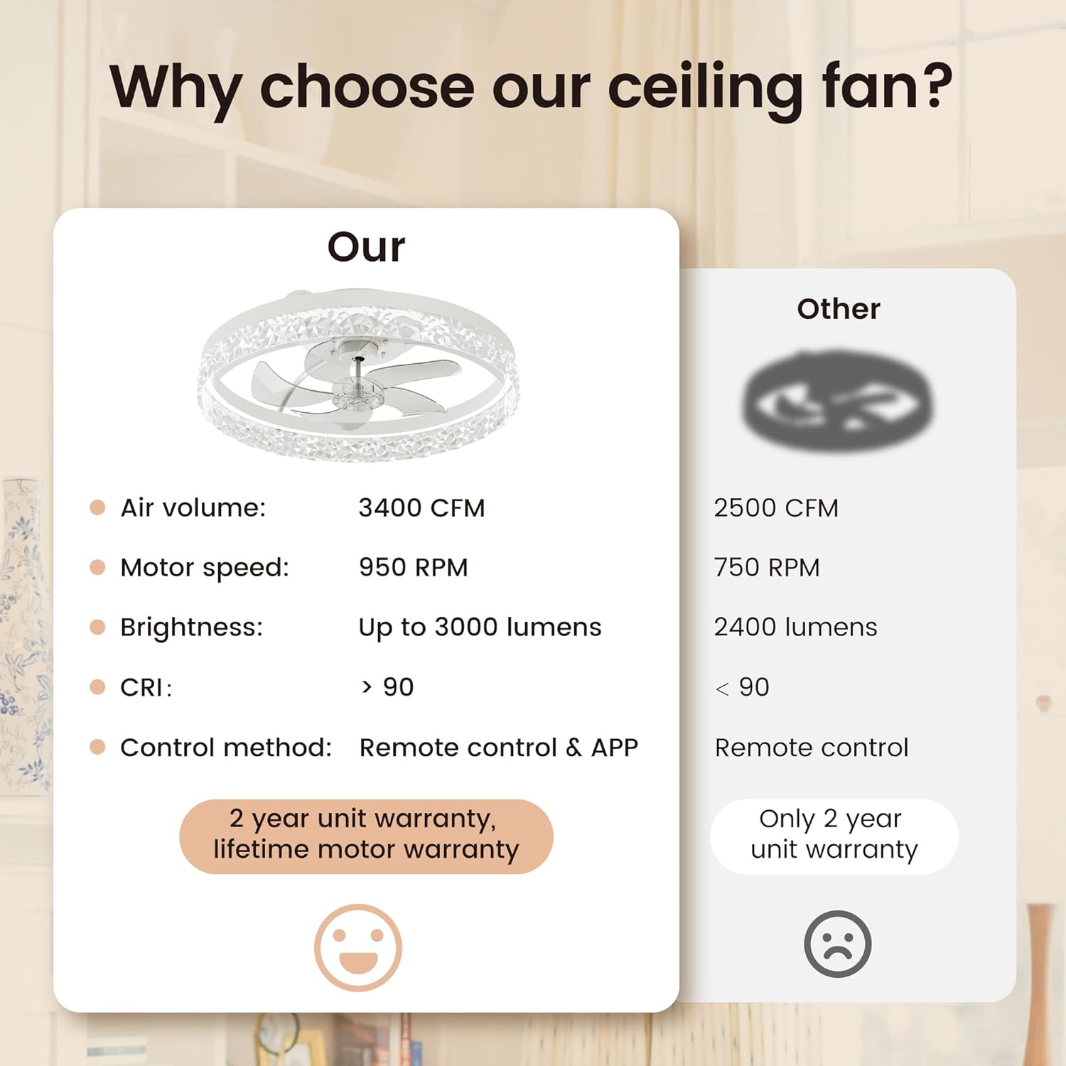 This 20″ ceiling fan with light combines modern design and functionality. Its crystal-like design adds elegance, while the dimmable LED light creates a variety of atmospheres. It’s ultra-quiet, easy to control with an app or remote control, and easy to install. An excellent choice.