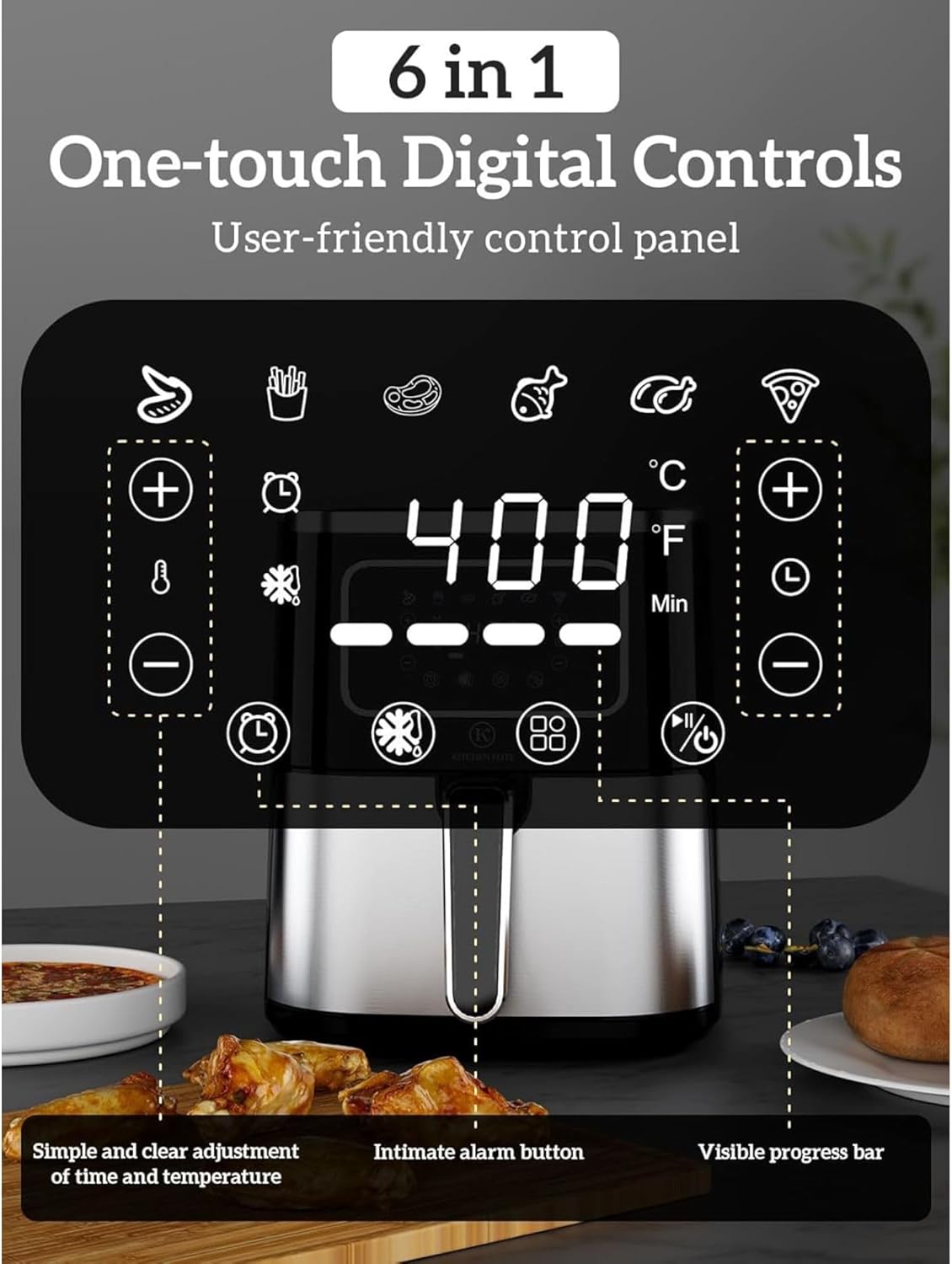 Digital Oven: Air fryer achieves fast and even cooking with 6 preset options, digital display, and adjustable temperature range from 150–400°F for crisp results