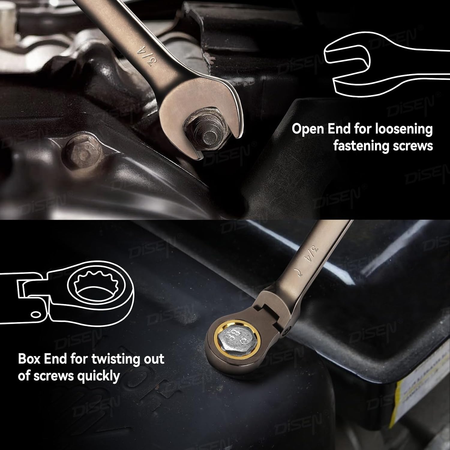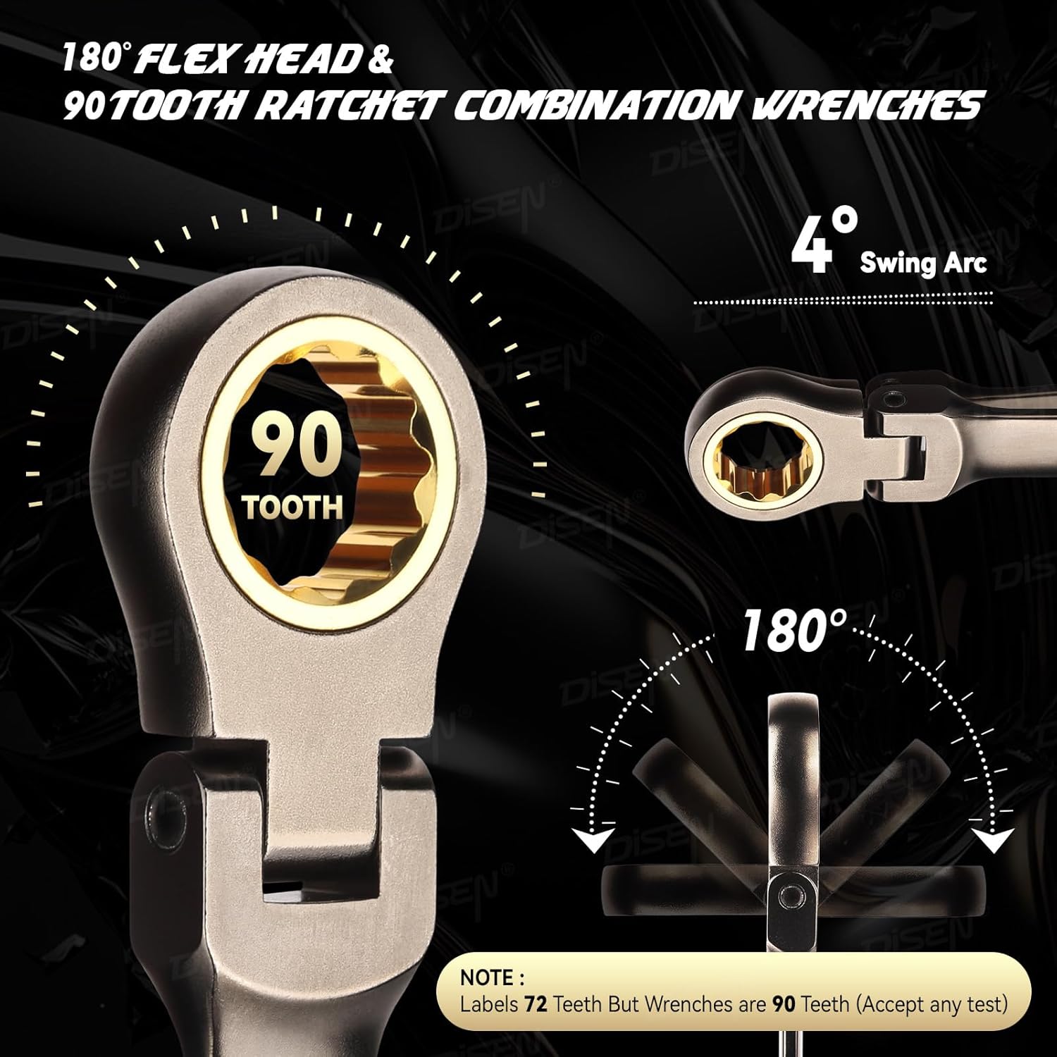 【90-Tooth Effortless Access in Tight Spaces】- DISEN Flex-Head Ratcheting Wrench Set features 180° Flex-head wrenches with 90-tooth ratchet gears, enabling easy maneuvering in narrow spaces with just a 4° swing arc.