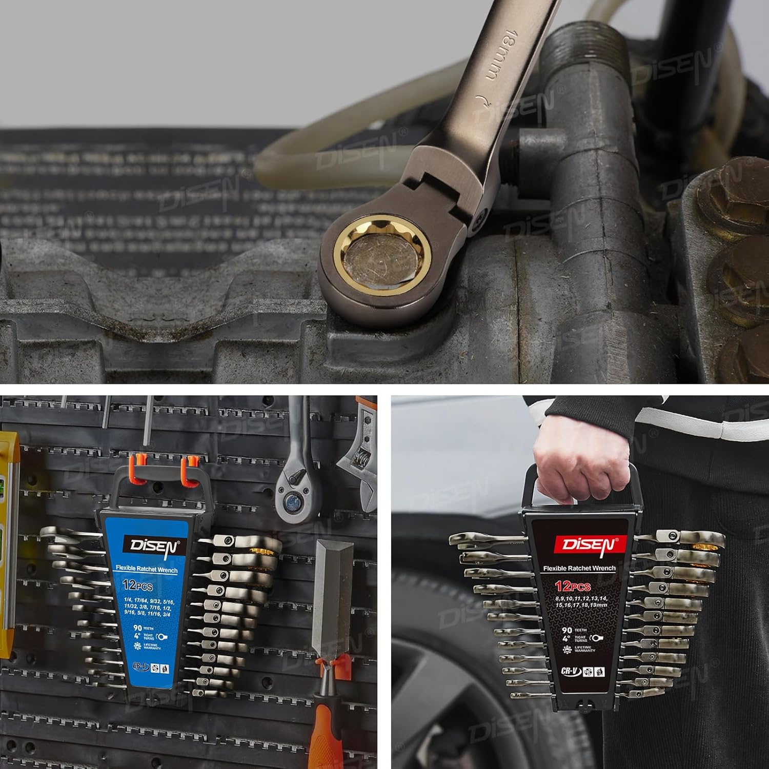DISEN 12 Pcs Flex Head Ratcheting Wrench Set 90 Teeth, Combination Ratchet Wrenches Set SAE1/4 to 3/4″, Cr-V Steel, 12-Point, Nickel Plating with Organizer Rack Visit the Store