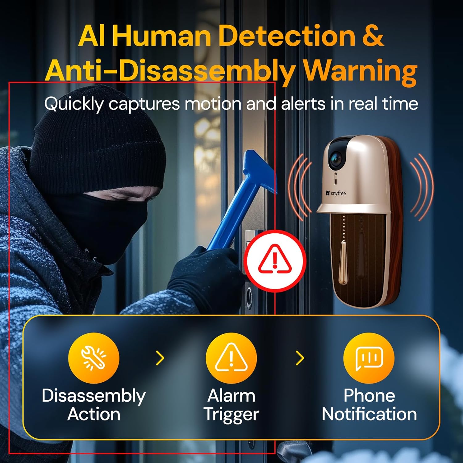 [Unique Destruction Alarm and Privacy Protection] When someone deliberately attempts to disassemble the doorbell: Disassembly Alarm > Phone Action > Trigger Notification. After binding, only users authenticated via the mobile app can access the feed, preventing privacy