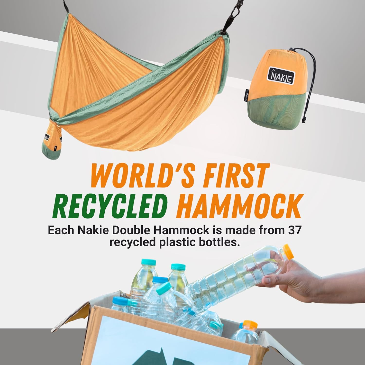 WORLD’S FIRST RECYCLED HAMMOCK – This Nakie Double Hammock is made from 37 recycled plastic bottles. We are doing our part for the environment and reducing the amount of plastic entering our landfill and waterways. We want to make a difference not just a profit.
