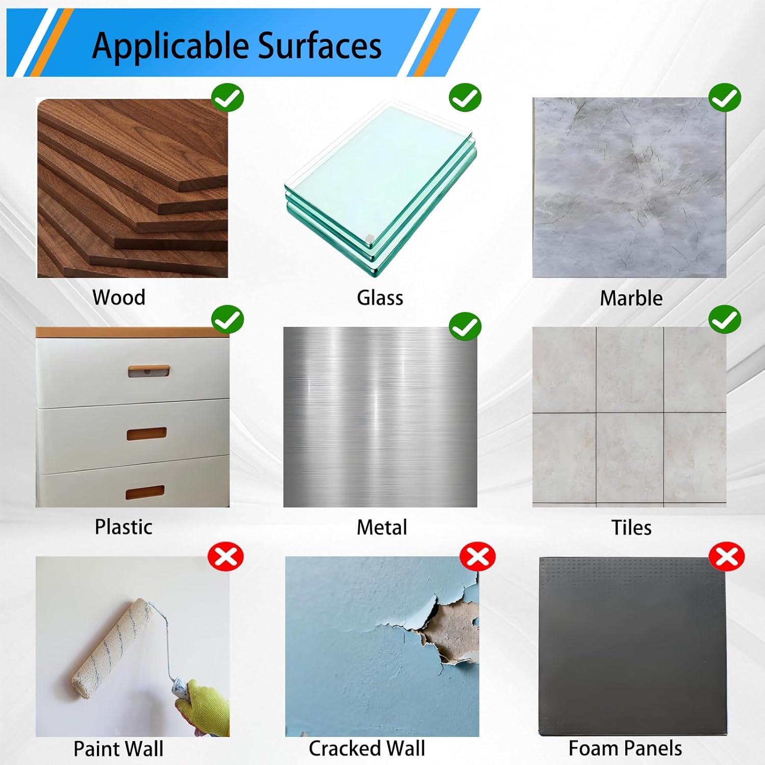 Note:adhesive strips applicable surfaces glass,plastic,wood,metal,marble.unsuitable surfaces wet surface,cracked wall,powed wall and foam panels.