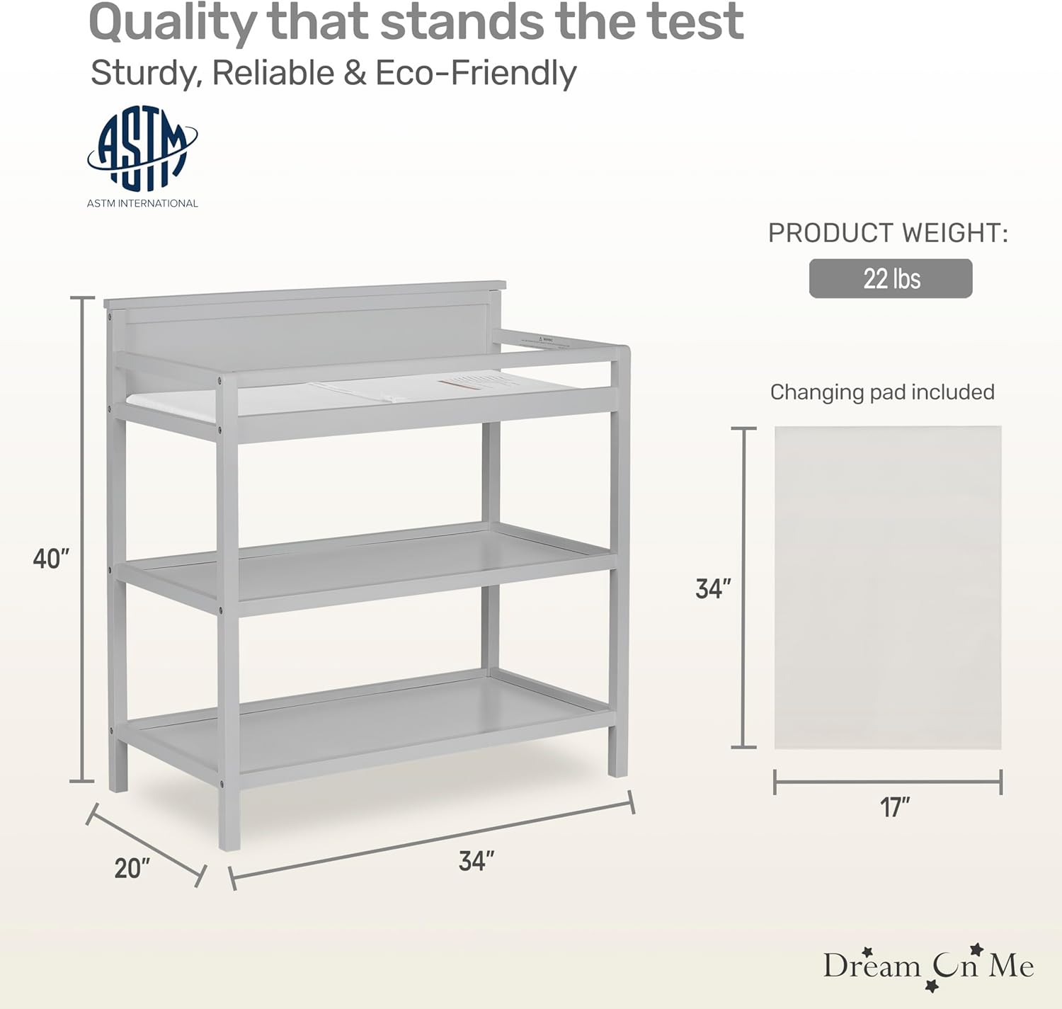 Dream On Me Jax Universal Changing Table is perfect for any nursery. This changing table has a clean modern line design, with a water resistant mattress pad for changing including a safety strap with a fully enclosed dressing area for extra security. Dream On Me Jax changing table has 2 fixed shelves for open storage which is ideal for diapers, wipes and other essentials. This changing table can transition into a night stand as your baby gets older. Dream On Me Jax changing table coordinates with All Dream On Me Crib. All Dream On Me products meets or exceeds government and ASTM safety Standard.