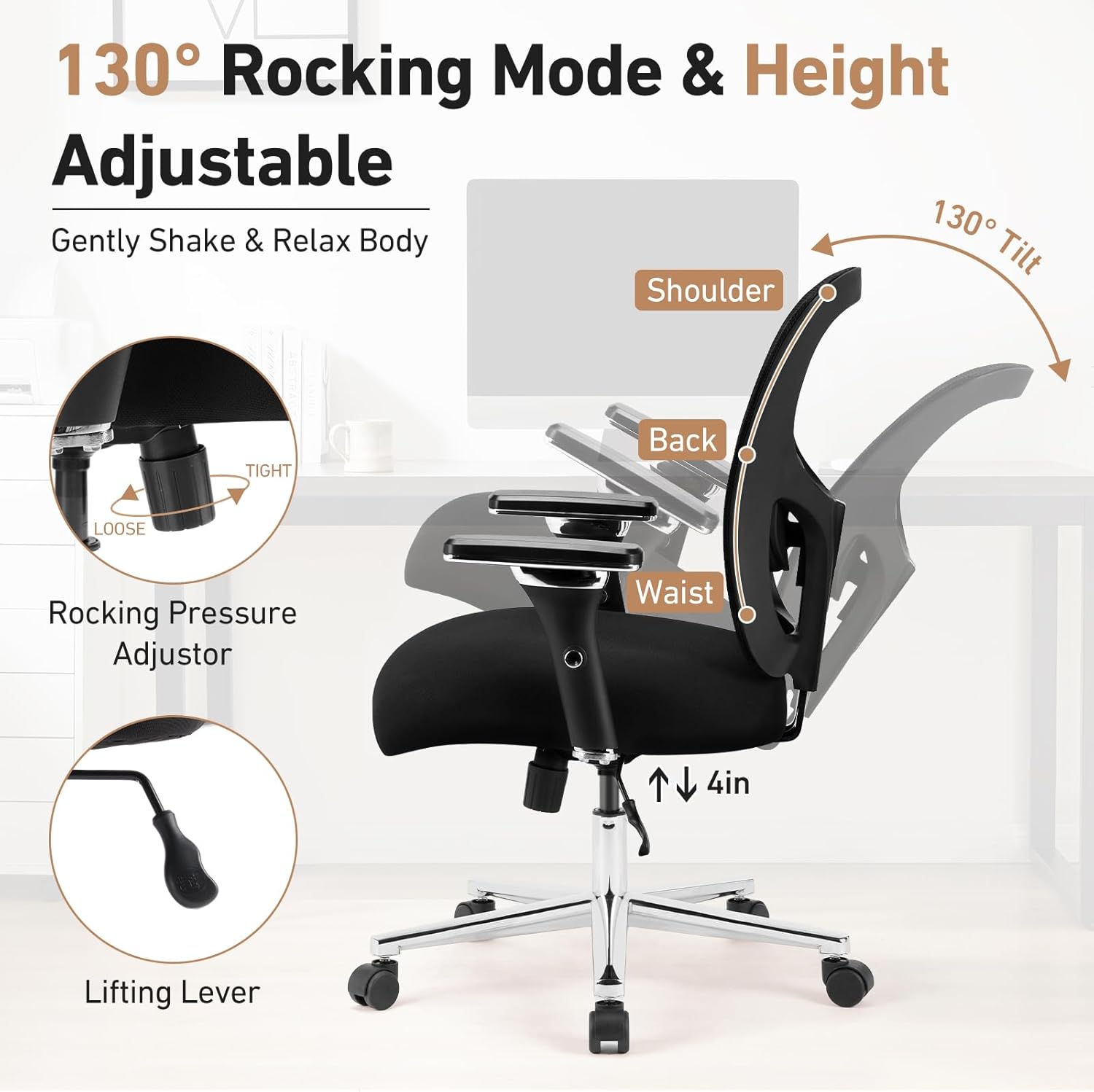 The height of this comfy mesh chair from the floor to the seat is 18.5″-22.44″ and the adjustable height is 3.9″
