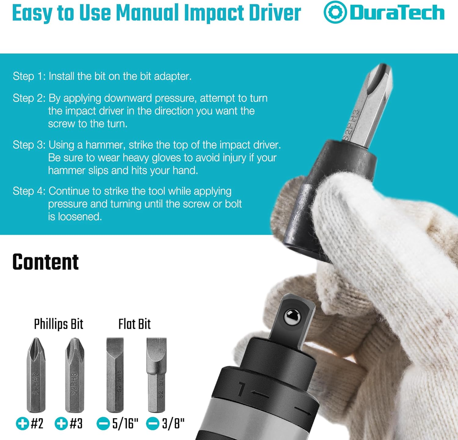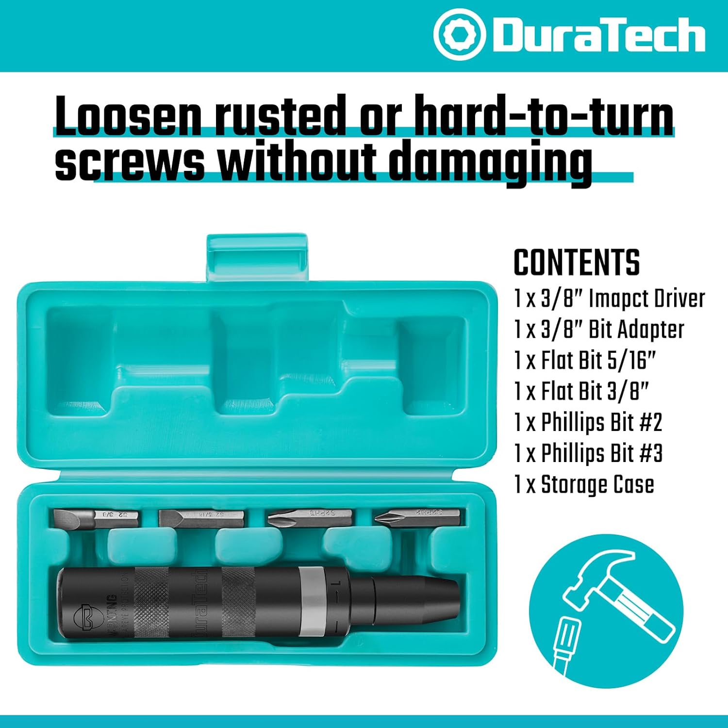 Be the first to review “DURATECH 3/8 Inch Drive Manual Impact Driver, Reversible Hand Screwdriver Set, with S2 Steel Bits, 5-Piece, for Tighten/Rusted Fasteners, Organized in Storage Case”