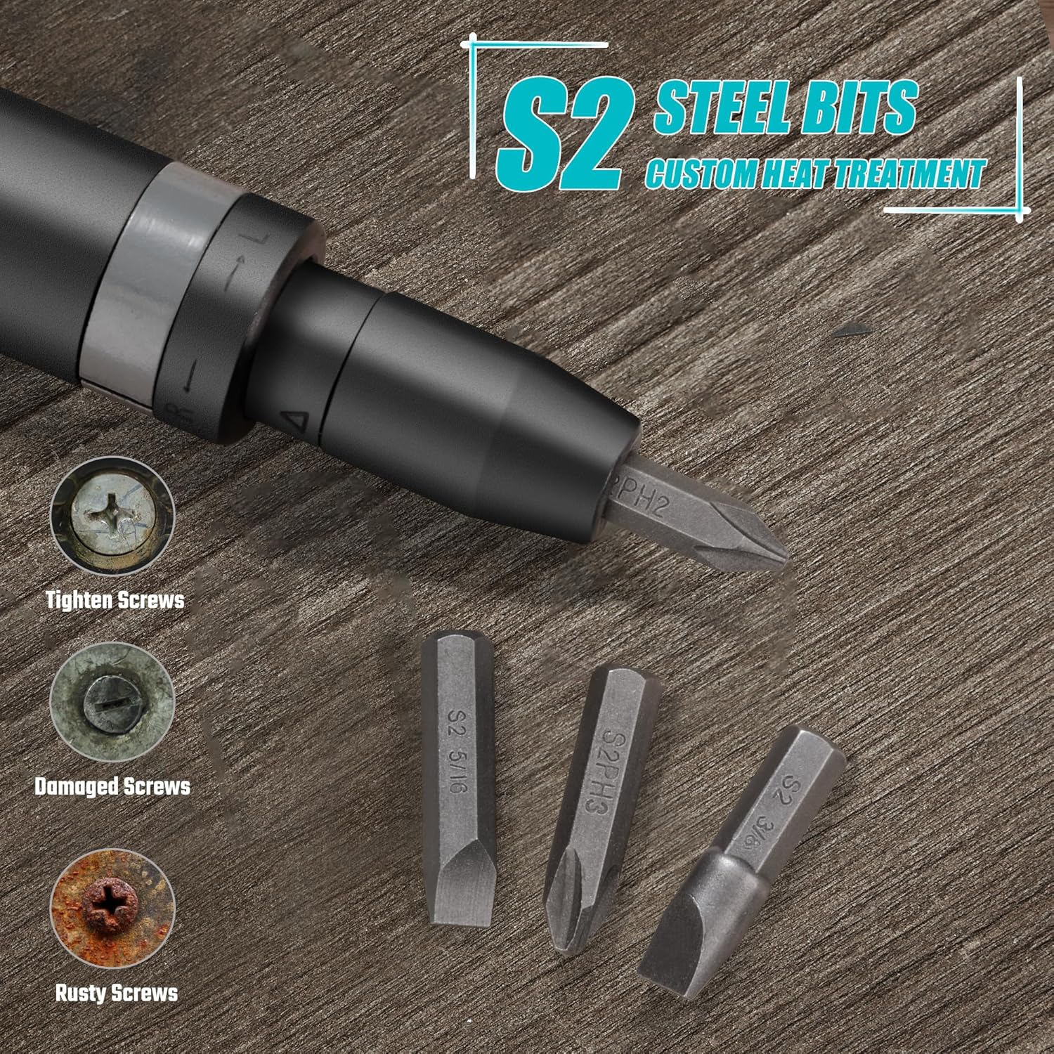 Dual-action reverse impact screwdriver designed to make your job easier. When set to “L”, the screwdriver turns to the right to tighten the screw, and when you need to loosen the screw, change the setting to “R” to turn it to the left