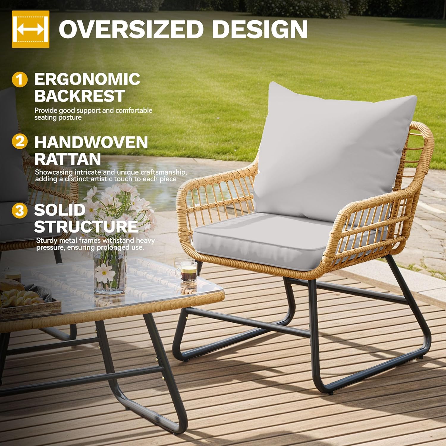 Heavy-Duty Outdoor Design: Crafted with durable powder-coated steel wrapped in weather-resistant rattan, our patio table and chair set resists rust and provides strong load support, offering lasting comfort and peace of mind for every outdoor moment