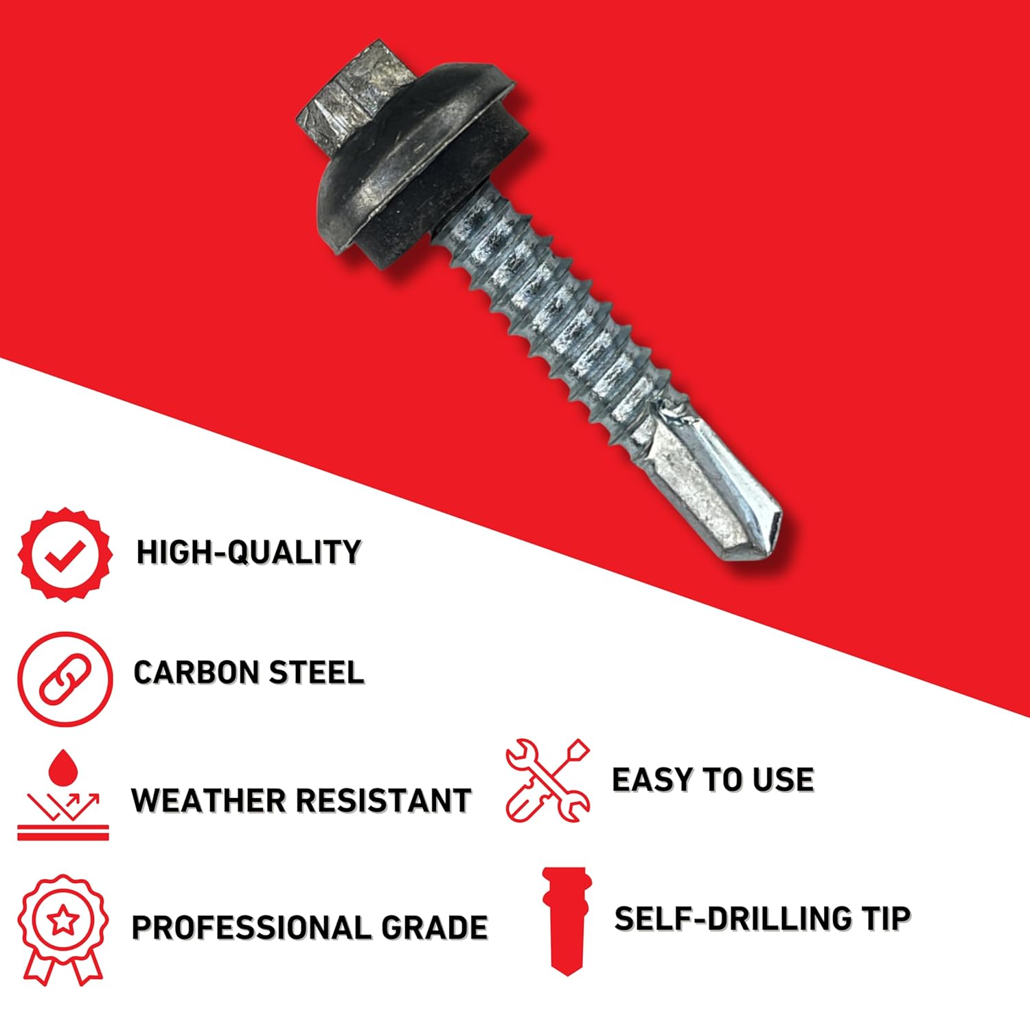 #14 x 1.25″ Long-Life Dome Cap Metal Building Screws are the perfect replacement screw that will last for years to come. With an oversized diameter and a 5/16″ hex head, replacing old or backed-out screws is easy. The dome cap completely covers the EPDM washer, protecting it from UV damage and preventing cracking over time. Zinc/Aluminum alloy head prevents red rust. Self-Drilling tip is perfect for metal-to-metal applications, securing fastening 2 layers of 26-gauge steel with no strip-out. 250-Count bag with included 5/16″ magnetic hex bit driver makes the job simple and easy!