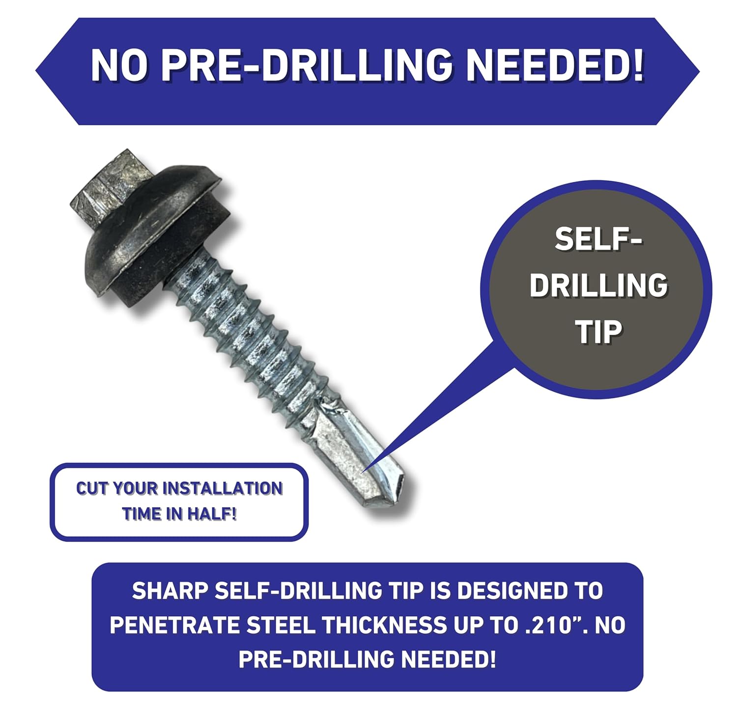 {Self-Drilling #14 ZXL Metal Building Screws} – Self-Drilling tip means no pre-drilling. – Easily penetrates steel up to .210″ thickness with no “point-walking”. – Will securely fasten panel side laps up to 16 ga. panel thickness with no strip-out when installed correctly.