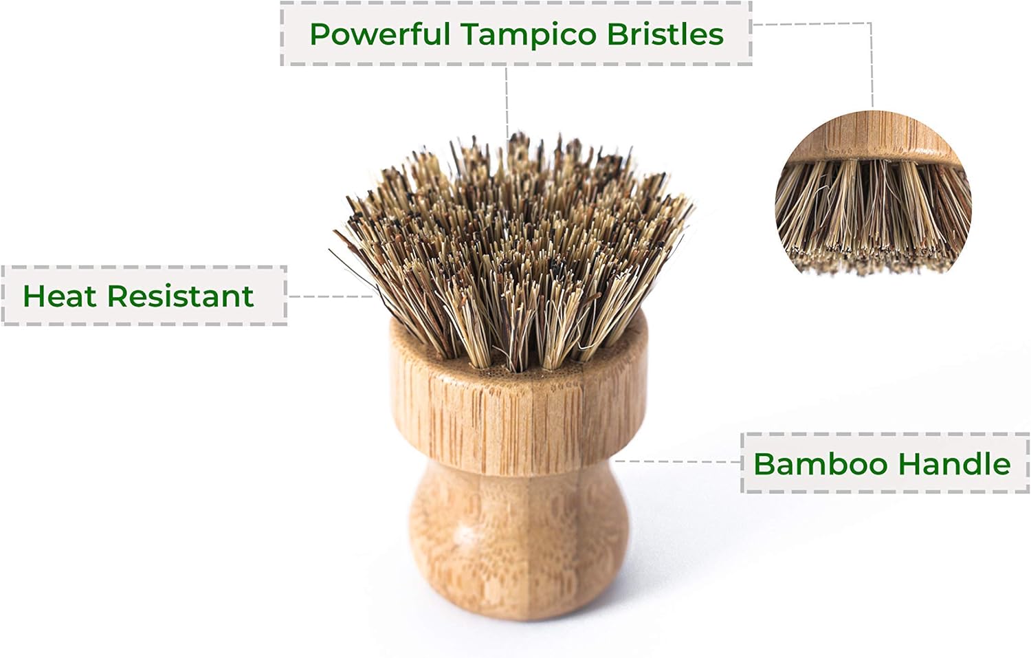 I was tired of buy plastic bristle brushes and having the through them away when they quickly became unusable. This product works great. It gets my pans clean and doesn’t damage them. I don’t have to worry about micro plastics getting into my food. Bonus is I can compost it when it is worn-out.