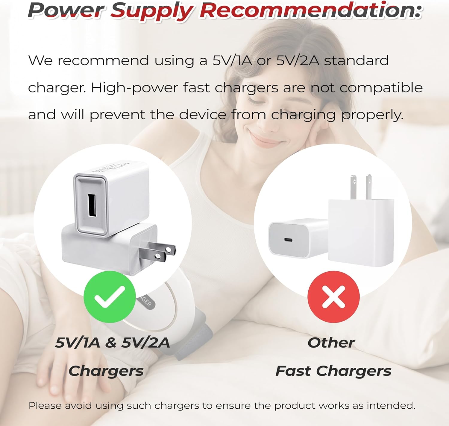【Power Supply Recommendation】We strongly recommend using a 5V/1A or 5V/2A standard charger. High-power fast chargers are not compatible and will prevent the device from charging properly. Please avoid using such chargers to ensure the product works as intended.