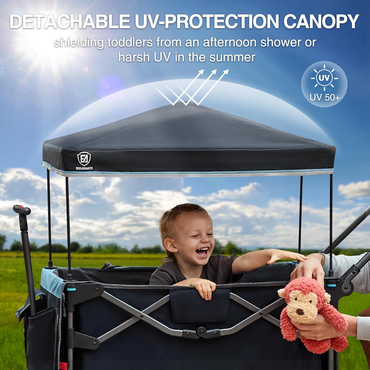 EVER ADVANCED Ultra-Compact Wagon for 2 Kids, Travel Foldable Push Pull Wagon Stroller with Removable Canopy, Adjustable Handles & Harnesses, Black Blue