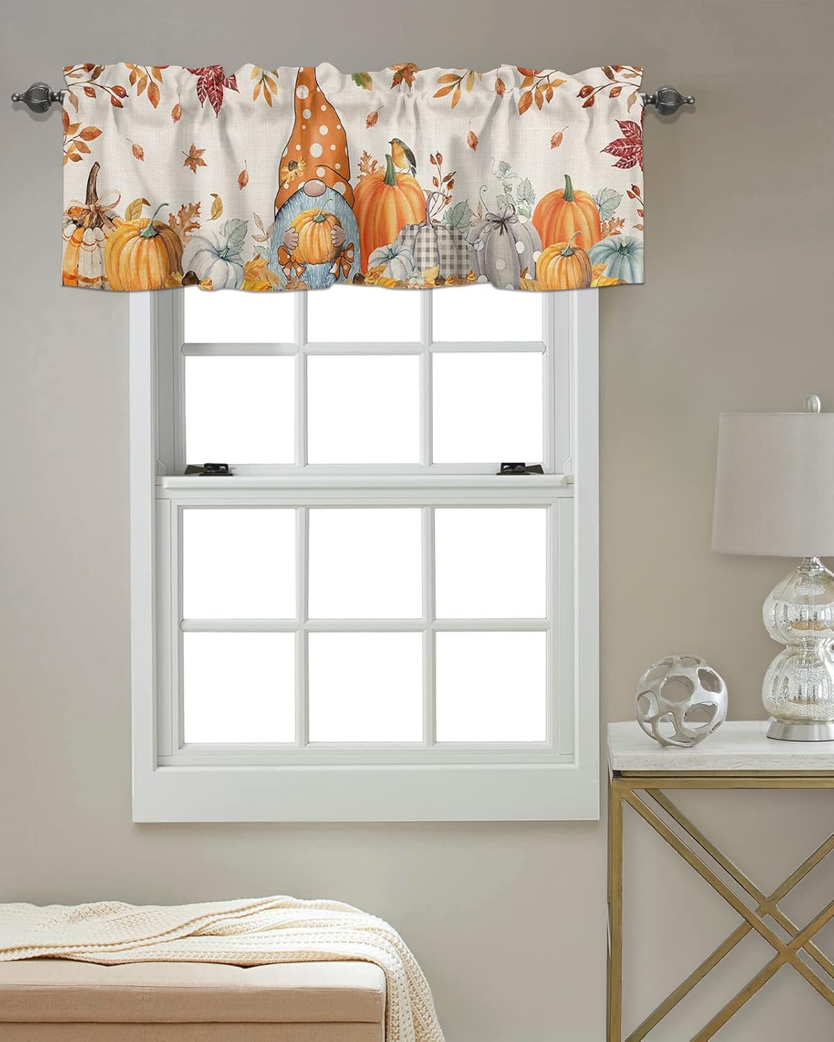 Fall Valance for Windows Pumpkin Gnome Curtains Valances Thanksgiving Rod Pocket Valance Window Treatments Autumn Maple Leaves Short Curtains for Kitchen Living Room Bedroom Window 1 Panel 60×18 Inch