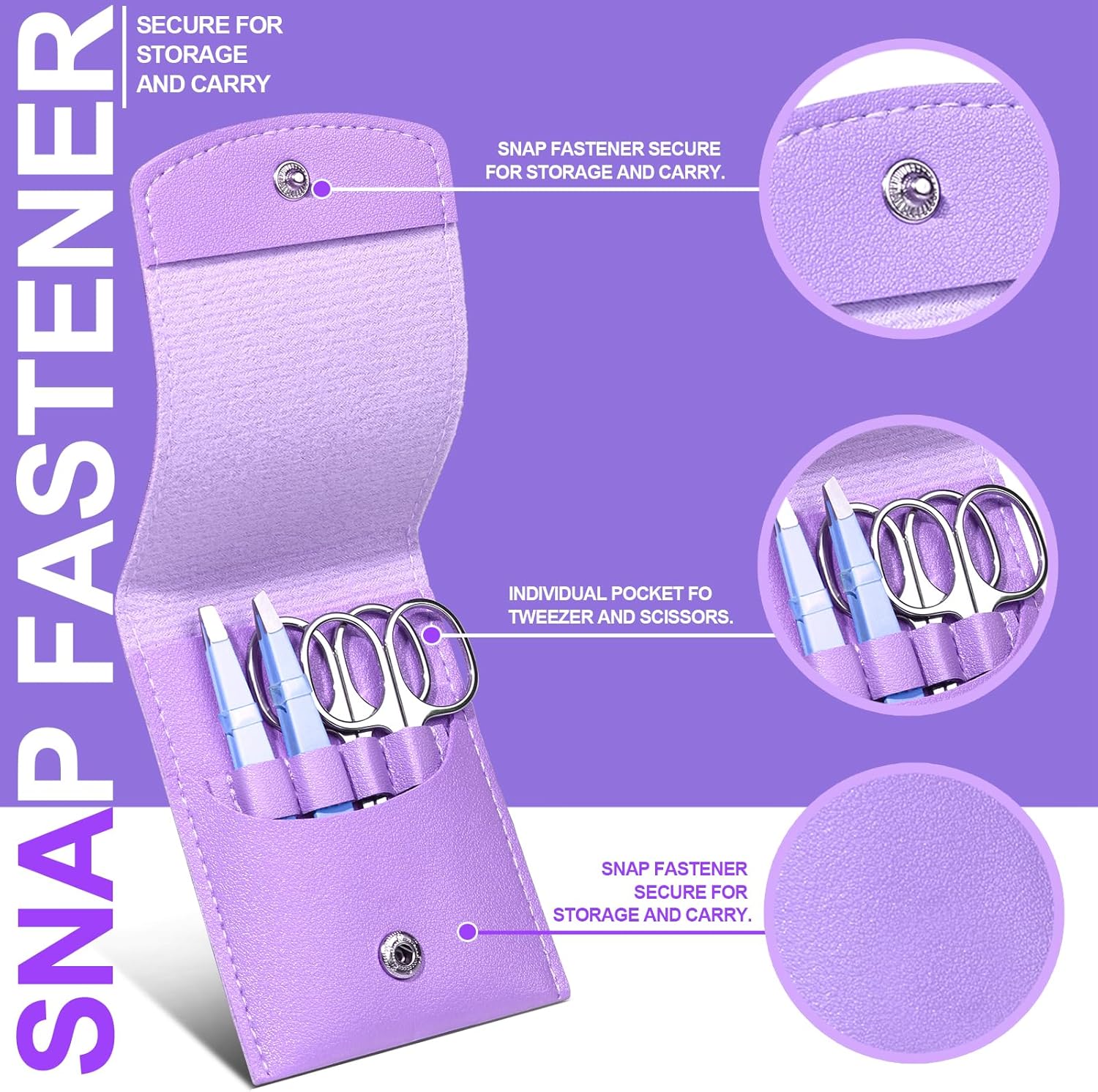 Professional Eyebrow Grooming Kit: The eyebrow kit comes with 1pcs small eyebrow scissors curved tip, 1pcs eyebrow scissors rounded tip silver. 1pcs eyebrow tweezers slant tip, 1pcs eyebrow tweezers flat tip. 1pcs eyebrow razor and 1pcs eyebrow brush. Total 6pcs eyebrow trimming tools with a purple leather travel case portable and orderly. One kit includes 6pcs practical and essential accessories for eyebrow.
