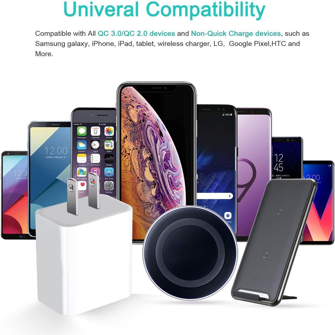 One Adapter for All Wireless Chargers.Support charge with all wireless chargers including wireless charger pad/ stand. And also support charging for non-QC mobile devices at up to 2.4A.