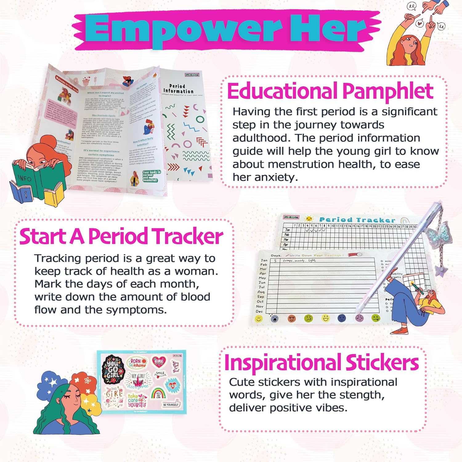 【Empower Her Knowledge】Period information pamphlet and period tracker will ease her anxiety, monitor period cycle and help the young woman to deal with her 1st period in a healthy way. Gift her period packs for young girls first time, be supportive!