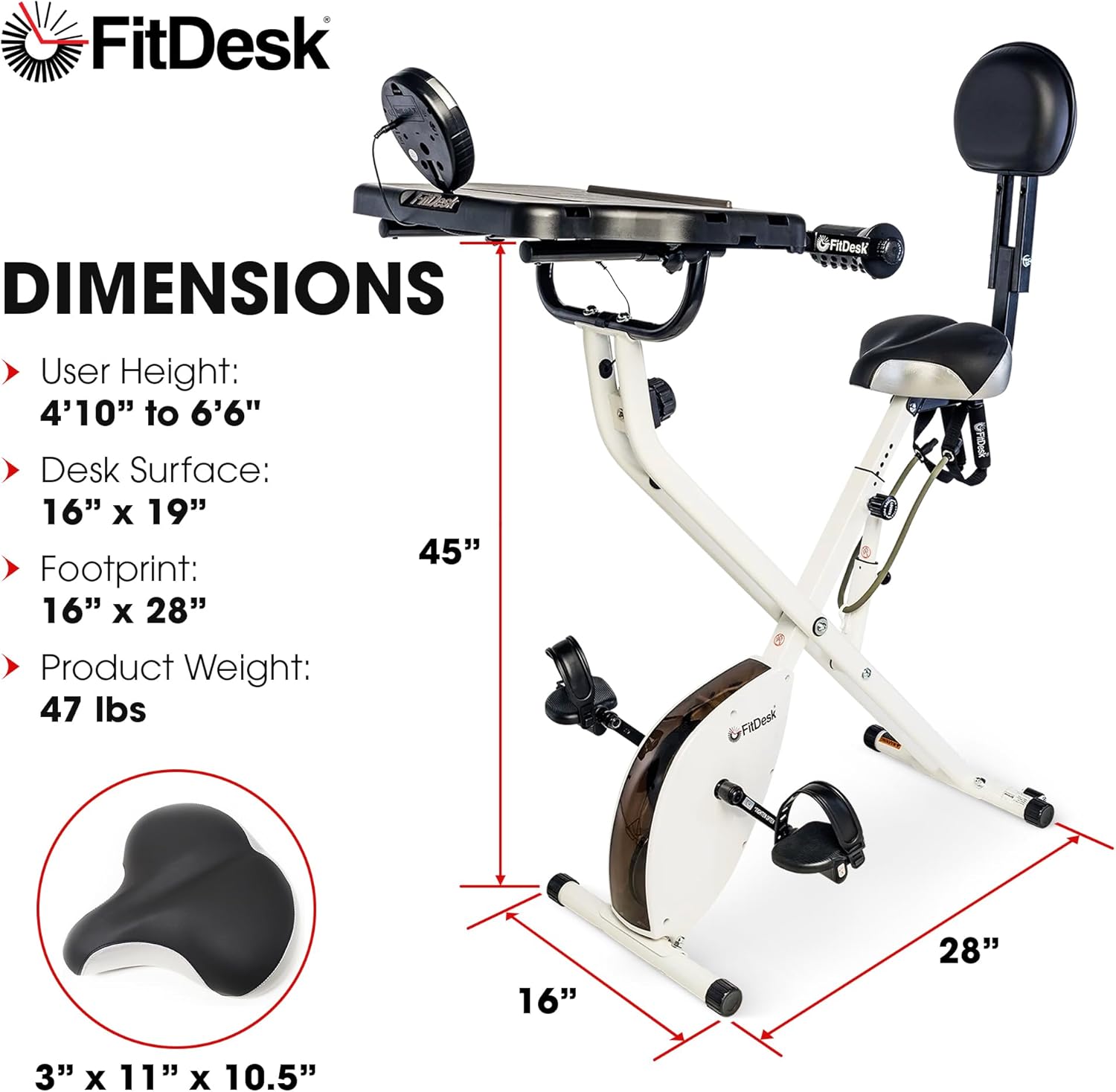 I bought the FitDesk on a Amazon Deal with the expectation I would try the product and need to return it because the quality was poor, it didn’t work as advertised, it didn’t fit, etc… As a result, I waited to write the review until I used the product for a few weeks. The good thing… I still have it!I looked over the reviews and noticed one particular issue that concerned me, specifically the “clicking” noise problem some people reported and am happy to say, after 3 weeks (riding it 5 days a week) and 300 miles on it, I have not come across this problem — the bike is still very quiet to use. I was also concerned with a few people saying it was not stable (it can fall over) — This is certainly not the case. I am 6’3″ at 240 lbs and the bike is solid on the floor — it doesn’t move or wobble at all. It’s a well constructed metal frame that is compact to fit in a corner (even folds to be stored) and is completely stable to ride on.I said I was 6’3″ tall and the bike fits me just fine — I was amazed it did as many products seem to be designed to accommodate people in the 5′ – 6′ range and are limited in their customization. With the FitDesk bike, the seat post can be raised higher for even taller people but the desk portion cannot. As setup, the bike is perfect for me with my computer and the adjustable arm bar works great with the foam pads to rest my arms on while working on my computer. The desk also slides forward and back so I can stretch out my back and change seating positions easily as I ride. I find myself spinning easily during certain online meetings I am attending where I need to speak or am writing emails, and spinning more aggressively when I need to sit and listen.The bike computer is more than adequate, it tells you the time on the bike, your speed, current trip mileage, odometer and calories burned for the session. I like that I can stop, take a break or answer the phone, come back and the bike did not forget my time, distance I traveled and calories burned when I stopped pedaling — it picks up where I left off and only resets everything when I push the reset button. (the odometer, just like a car, always increases and isn’t reset) I know some people want heart monitor functions but if you have a watch (polar, iWatch or other) you likely have a more accurate method of doing it already. I don’t know who close the calorie count is, it’s likely an approximation and should only be treated as an estimate but makes me feel good. (I have an elliptical in the garage which I feel is overly optimistic on how many calories I burn)The bike has a tension knob with a range between 1 & 8, with 1 – 3 being very similar (easy spinning) and 4 – 8 changing the tension more significantly. A good range of tension and will likely meet everyone’s needs.The thing I don’t like about the FitDesk bike is the seat. Others have said this and they are right, it looks like it should be comfortable but is not. I bought the Universal Adaptor as an option and put my own seat on it and am a happy camper now. I wonder why FitDesk doesn’t just ditch the seat they provide and ship the bike with the Universal Adaptor and include a standard seat in the first place? Anyways, if you’re looking at this bike, invest in the adaptor and you can select any seat you want for it.To summarize:Pros* Well made — stable (won’t fall over when you ride it), compact, foldable to be stored and very quiet* Fits tall riders (6 feet +) with a good range of seat adjustment* Really does get used! If you have to sit at a desk, why not spin (even if leisurely)Cons* The seat is horrible — get the universal adaptor FitDesk sells as an option and pick the seat you want.I use this bike every day I am working, pedaling between 15 – 30 miles a day. It’s an easy way to get exercise without stressing about getting enough time before or after work.** Just did 70 mins & 25 miles too 🙂