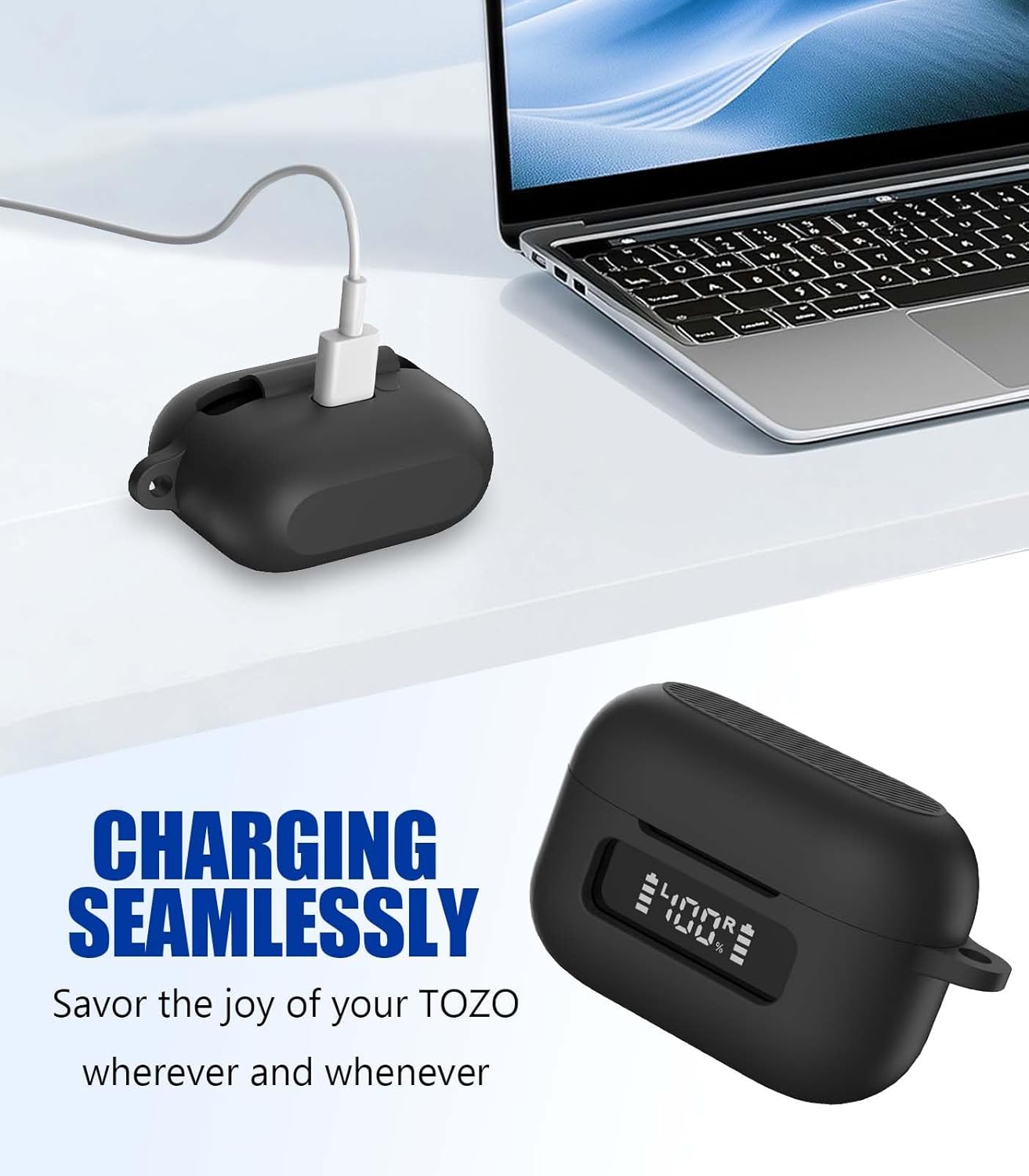 Precise Incision -The protective cover is precisely cutting, and reserved charging port, fast charge your TOZO Hybrid Active Noise Cancelling Wireless Earbuds charging case without remove the charging box cover.