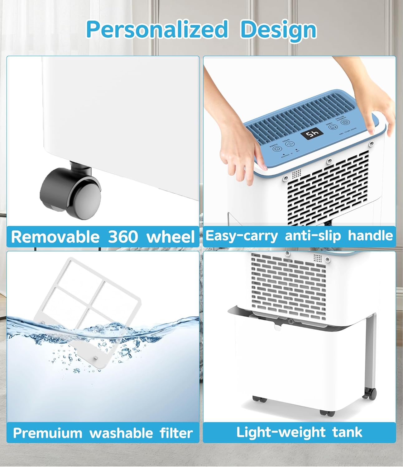 【360° Mobility with Swivel Casters】Equipped with 4 removable casters, this portable dehumidifier glides effortlessly across rooms. Perfect for multi-room use (living rooms, RVs, closets) to meet varying dehumidification needs
