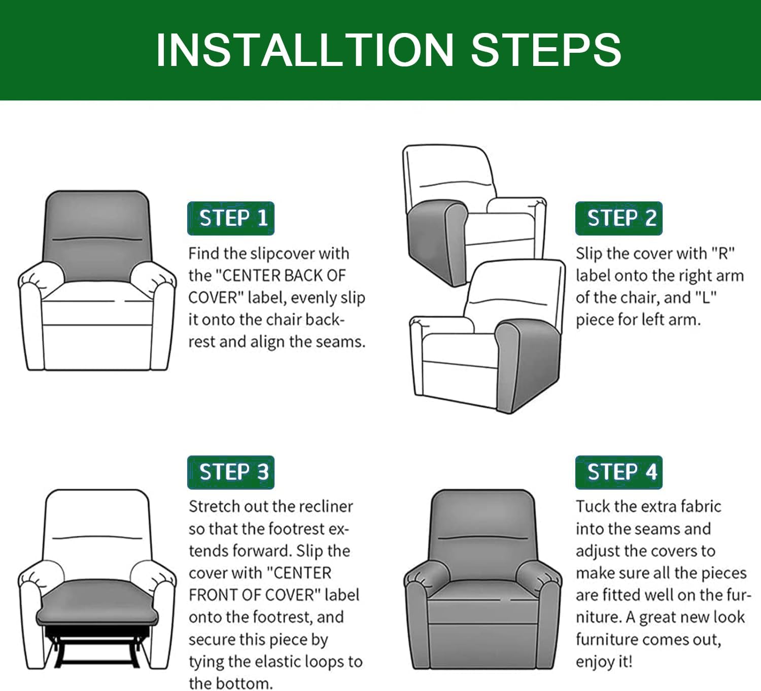 PRODUCT SIZE – FUANGUI lazy boy recliner chair covers is designed for recliners with a back width of 27-39 inches, a back height of 40-50 inches, a base width of 23-35 inches and an armrest side width of 30-40 inches, please refer to the attached measurement chart before purchasing.