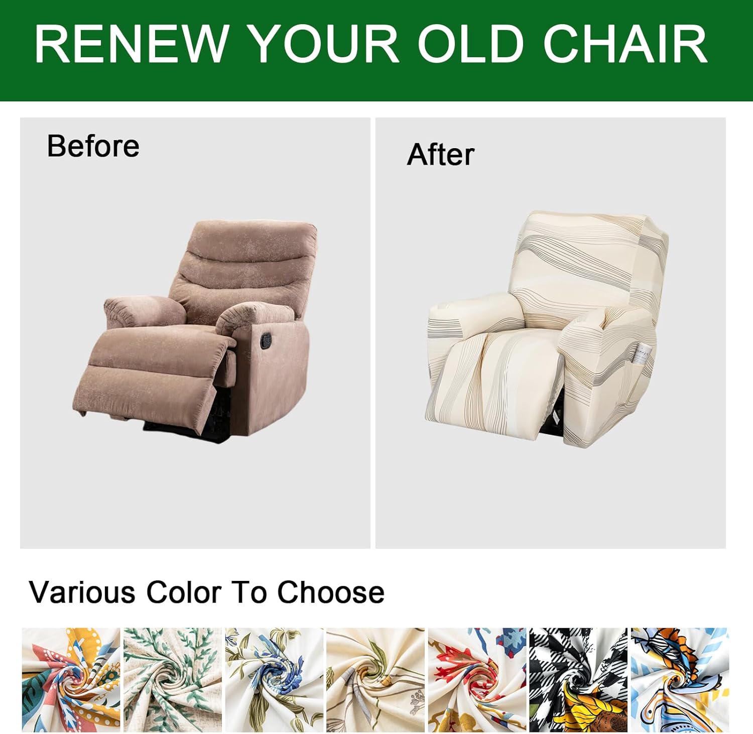 4 PIECES RECLINER CHAIR COUCH COVER – Small recliner chair covers set includes back cover, seat cover, two armrest covers and one side pocket, high elasticity material flexibly adapts to most standard recliners, separate design ensures easy installation, reduces wrinkles, gives furniture a personalised fit look, just like a custom-made.
