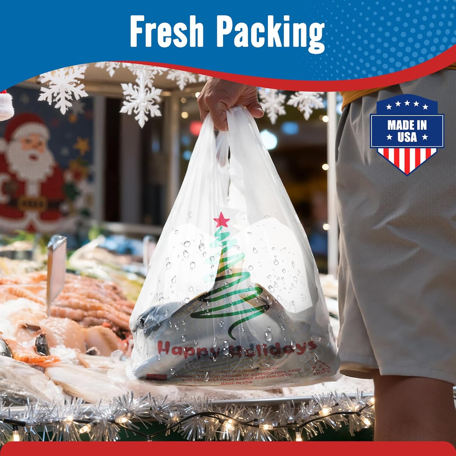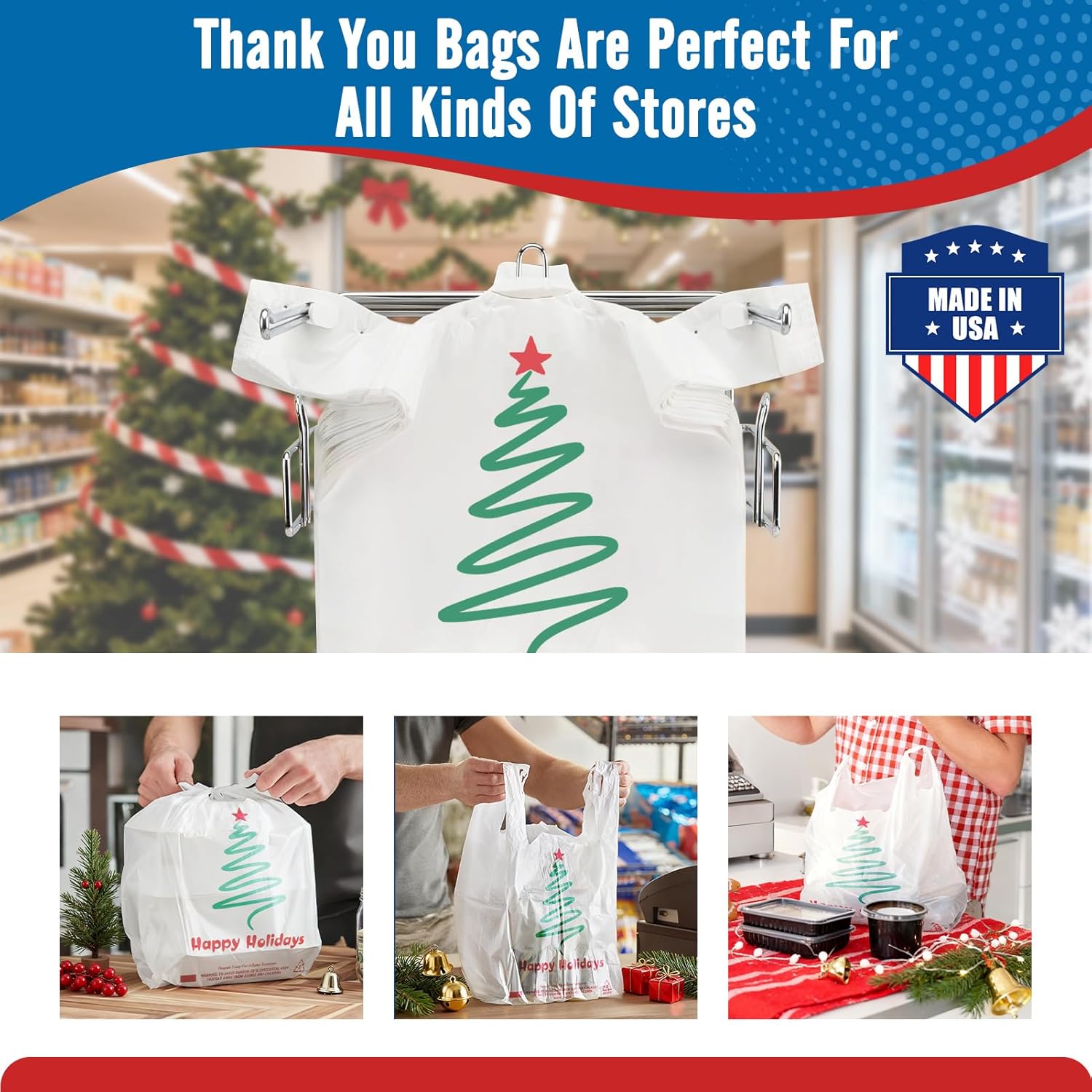 13 reviews for Fuxury 1000 Count Christmas Happy Holiday Plastic Tshirt Bags (11.5″ x 6.5″ x 21″), Grocery, Take Out, To Go, Retail Shopping Bags in Bulk for Small Business