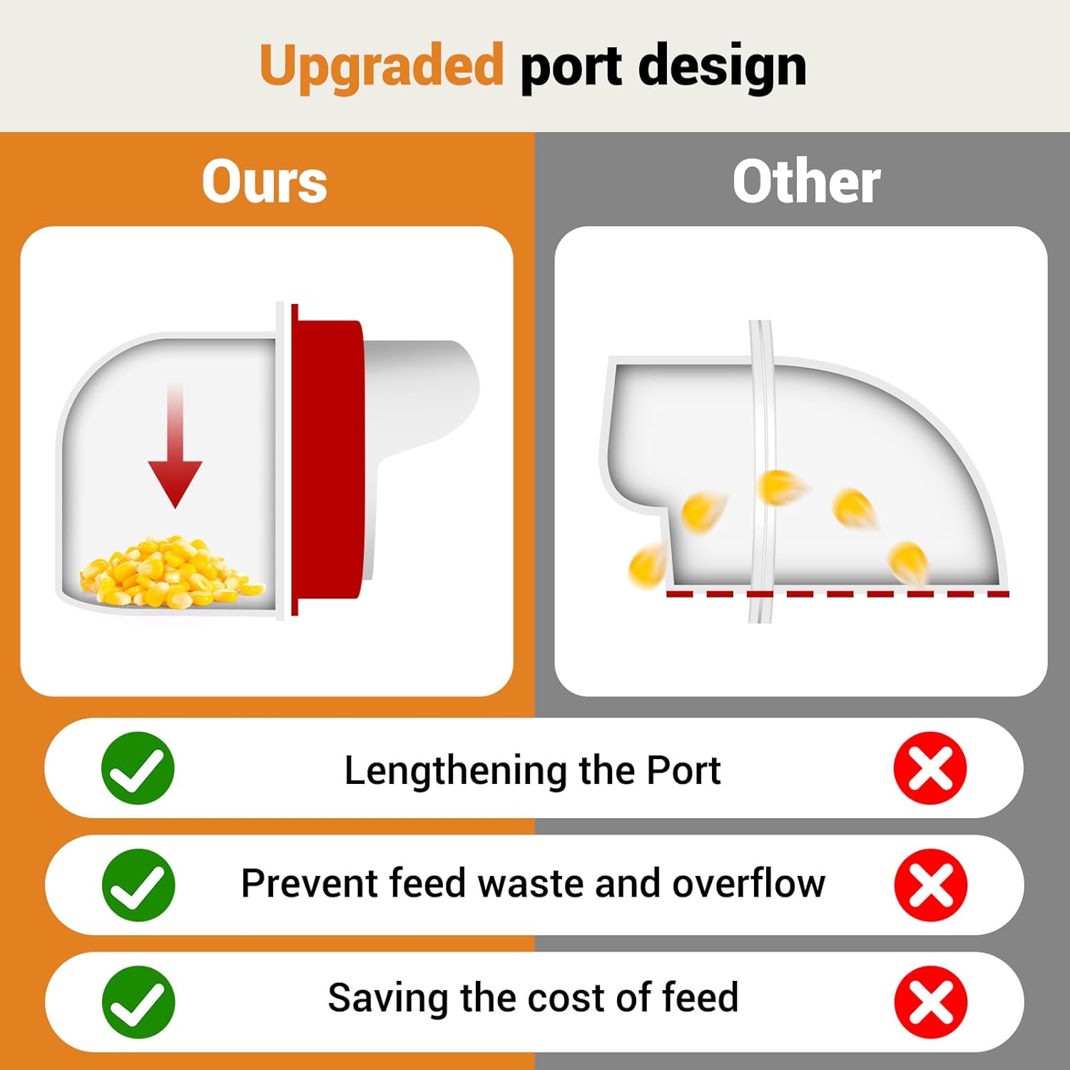 Upgraded Feeding Ports: Crafted from premium materials, our extended feeding ports cut down on feed waste and spillage—saving you money on feeding costs. Better yet, they keep other animals from sneaking in to steal your feed.