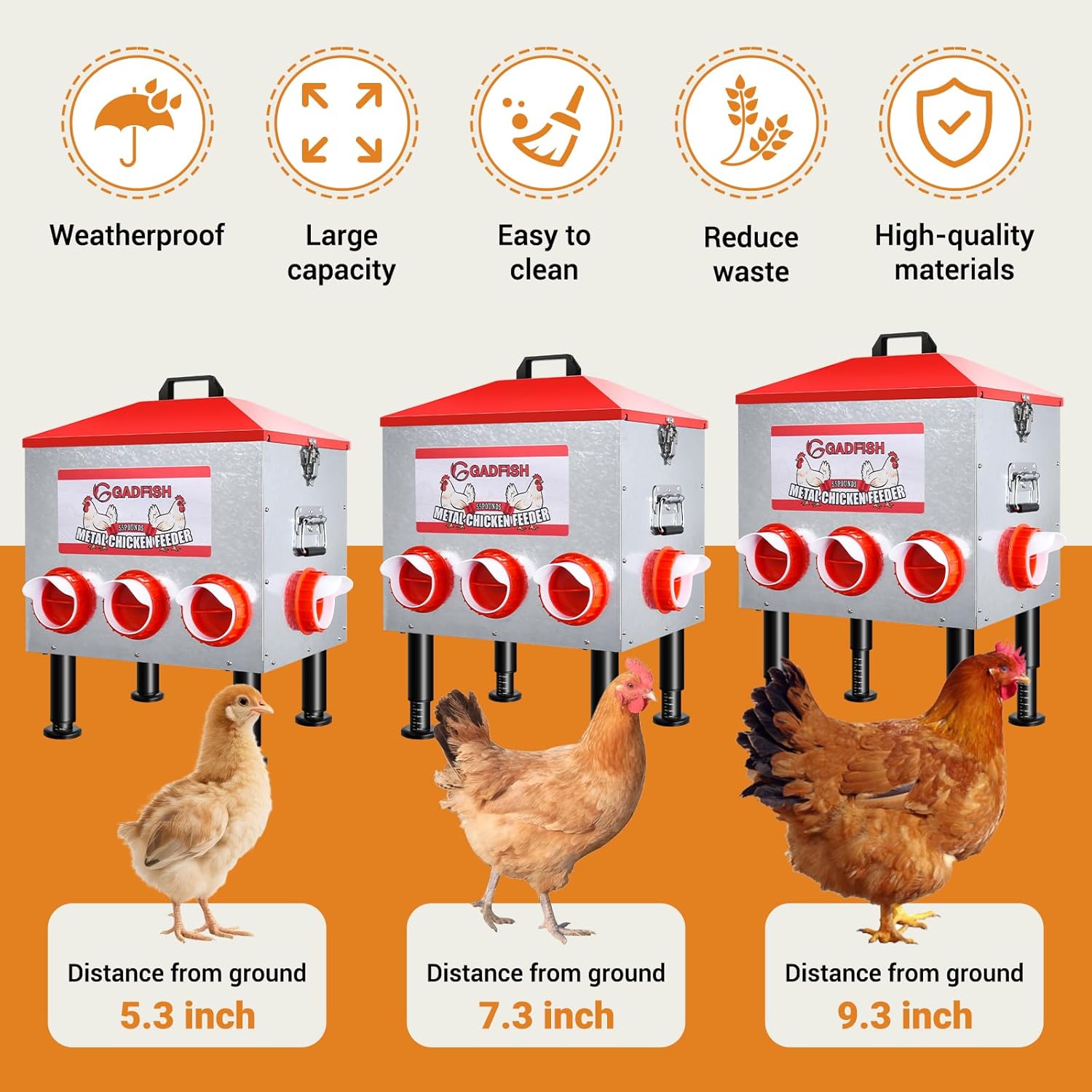 Durable and Sturdy: GADFISH automatic chicken feeder is made of high-quality metal and is long-lasting. Metal materials not only stand the test of harsh outdoor weather and time, but also effectively prevent animals from biting and damaging the products. What about maintenance? It is not prone to rust and is easy to clean.