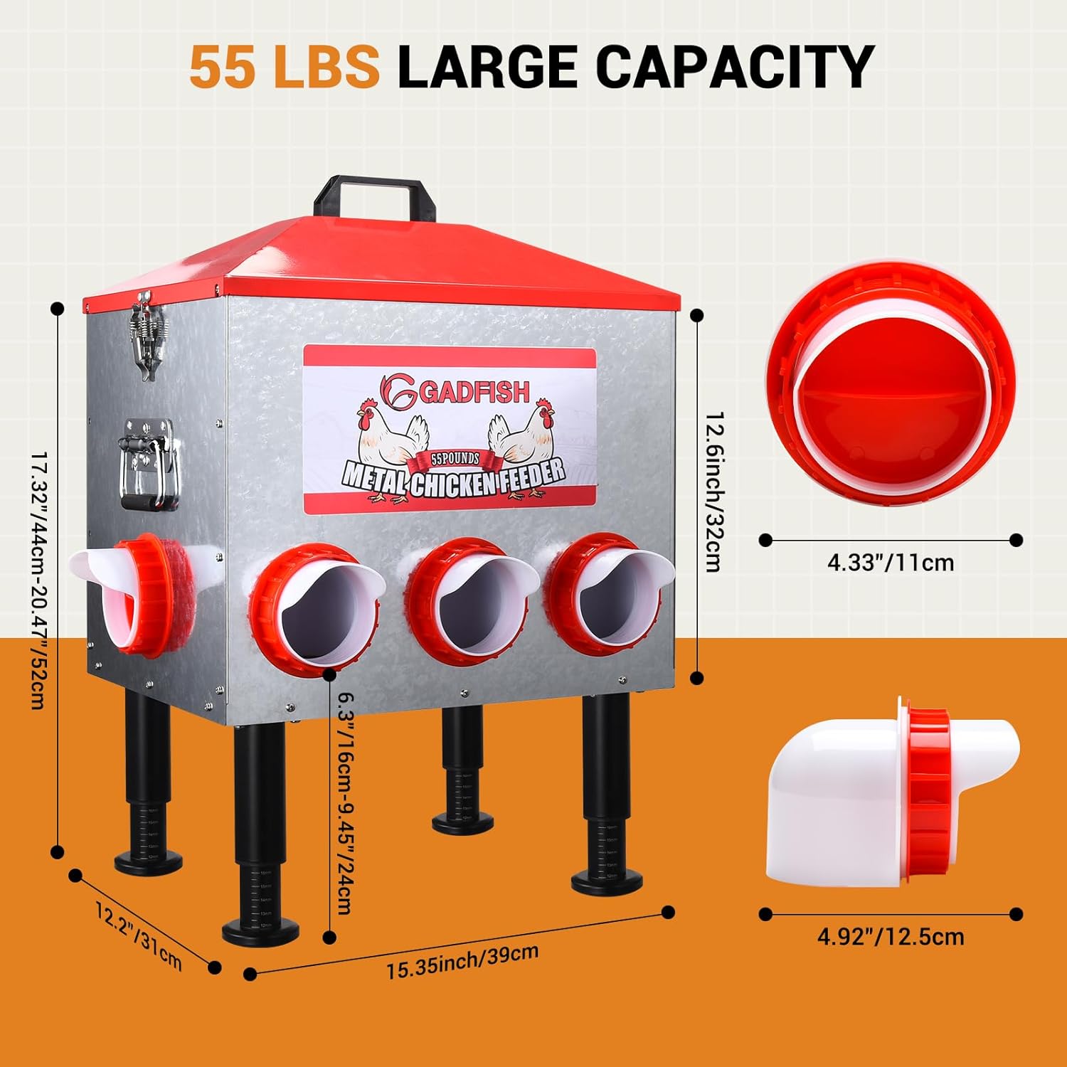 55LB Large Capacity: GADFISH automatic poultry feeder can hold 55 pounds of feed. It has 8 feeding ports that can feed 8 poultry at the same time. Filling it up once can minimize the need for frequent replenishment, saving your precious time and energy.