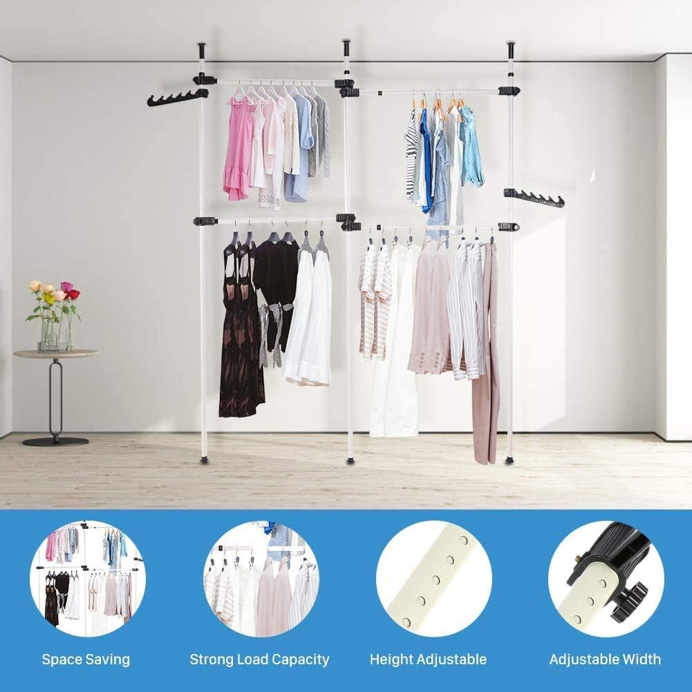Garment Rack Clothing Hanger, Heavy Duty Adjustable Closet Rod Double Rail,Simple No Drilling for Bedroom Freestanding Wardrobe Closet Organizer System ,3 Vertical Poles 4 Bars