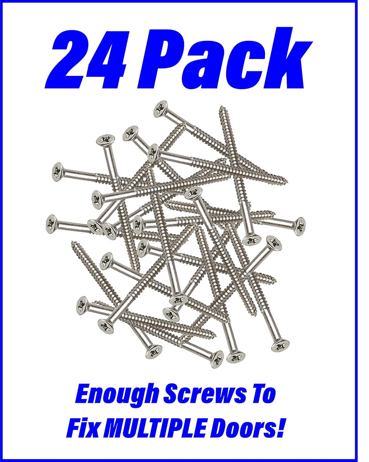 Replace your stripped door hinge screws with these extra long 3″ screws. These Satin Nickel stainless steel screws are perfect for aligning sagging doors, replacing stripped screws, or adding security to your door hinges and door frame. Our #9 x 2 1/4 inch screws are THREE TIMES longer than standard door hinge screws. Does your door scrape on the door jamb when opening and closing? Chances are your door needs aligning. Simply replace your standard-issue screws with our 3″ screws and your door will be pulled tightly back into the proper place. Is your door hinge pulling out of the door jamb? That’s probably because the small screws that came with the door have failed. By replacing them with our extra long stainless steel wood screws, you can rest assured that your door will be secured tightly to the door frame. Are you looking for added security when it comes to your doors? Our 2.25 inch screws are the perfect security screws. Replacing your standard door hinge screws with ours gets you up to 3X the door frame security! We are a small family business based in the USA, and we are truly thankful for giving us the opportunity to improve your home.