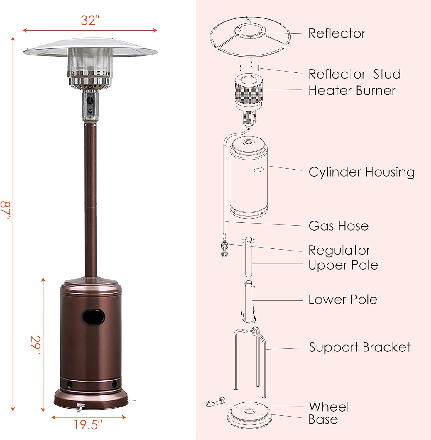 Premium steel is durable enough to stand the test of time High performance 50,000 BTU of heat ensures faster heating speed Requires a 20lbs liquid propane gas tank(not included) Flexible wheels and 2 handles for convenient transportation Anti-toppling design ensures safety during use Simple operation and adjustable temperature for better experience 3 stakes ensures overall stability on windy days Spacious warm area with a diameter of 15ft Suitable for various places, such as patio, deck and garden