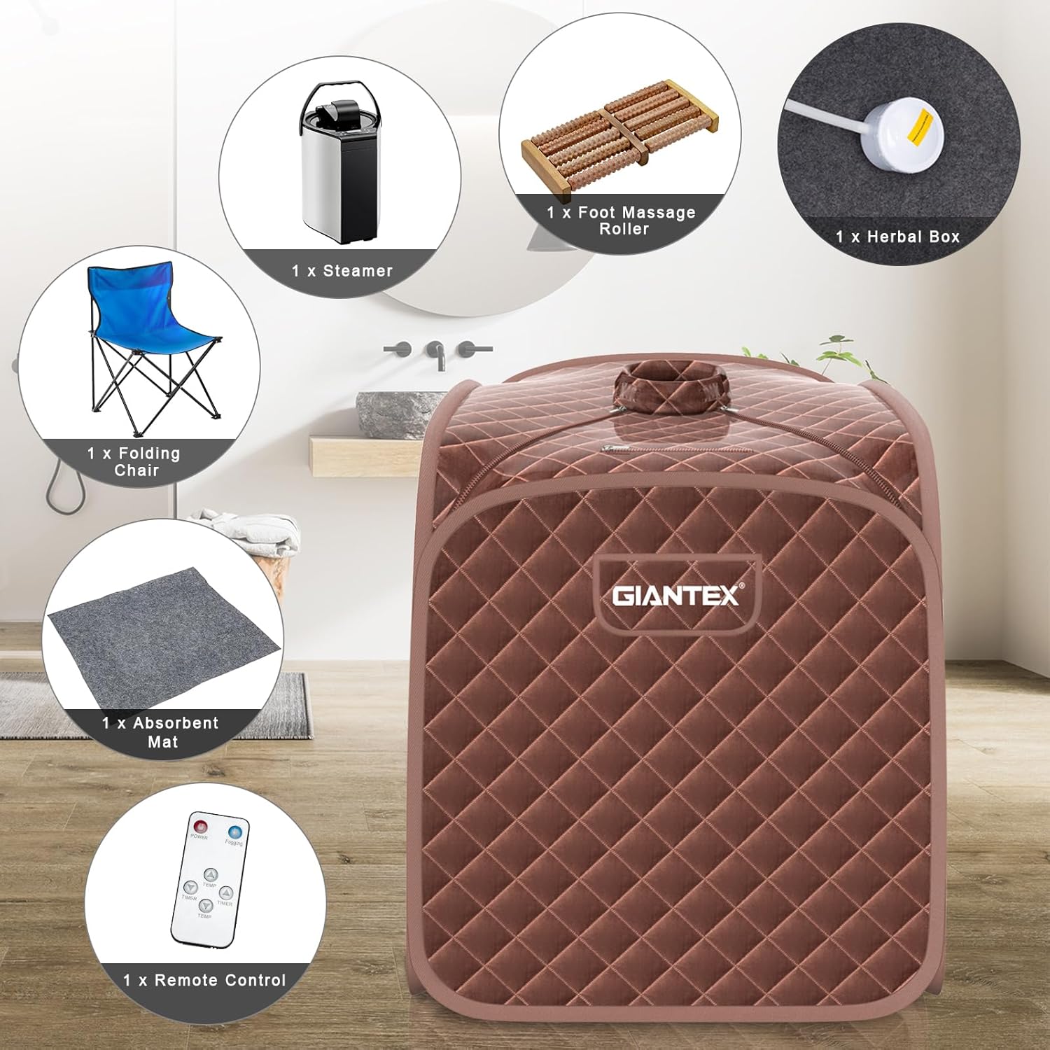 Giantex Portable Sauna, Sauna Box 3L Steam Box Remote Control, 9 Adjustable Temperature & Timer, Foot Roller, Mat & Foldable Chair, Steam Sauna for Single Person, Personal Sauna Tent for Home, Coffee