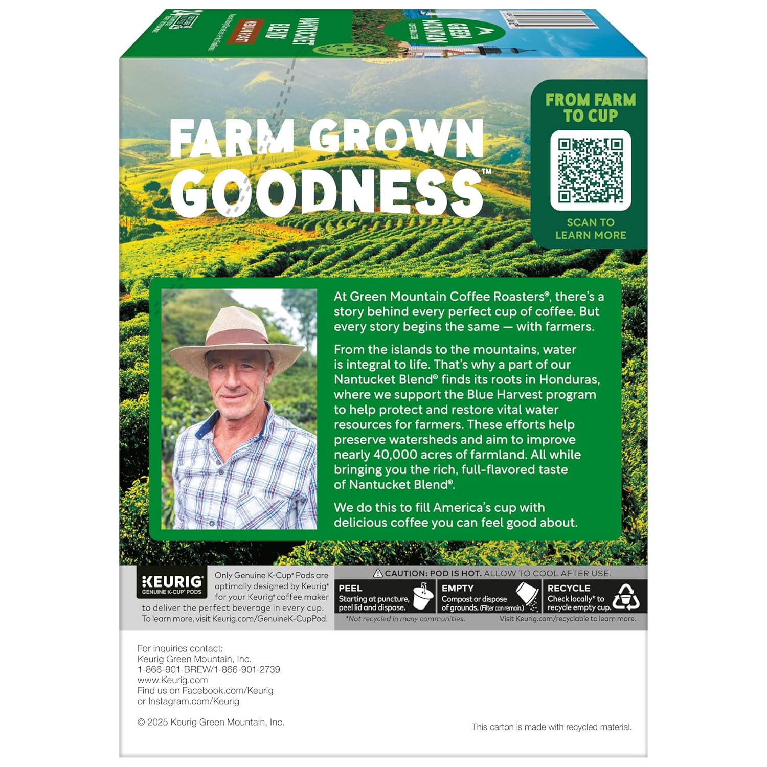 Of all our important natural resources, none are more previous – to life, to coffee, and to the world itself – than water. Since 2014, we’ve been supporting Blue Harvest’s efforts to protect and restore vital water resources in coffee and farming communities throughout Central America. In Honduras, our support helps Blue Harvest assist farmers like Mario in implementing water-smart practices, like using recycled, nutrient-rich water on crops to help preserve watersheds while producing a delicious well-balanced coffee. Efforts like these help coffee communities enjoy cleaner drinking water, while you enjoy the rich, smooth flavor of Nantucket Blend coffee in every delicious cup. The mountains are a special place. It’s where Green Mountain Coffee Roasters was born. It’s where we developed our adventurous spirit and commitment to improving the lands through sustainably sourced coffee. We’re driven to bring the world a richer, better cup of coffee. Be bold. Be alive. Grab a cup and get out there. The Green Mountain Coffee Roasters Nantucket Blend is complex mix of rich flavors from berry-hued African beans, carefully woven together with robust Indonesian beans and a touch of smoky French Roast. Caramel, chocolate, and dried fruit notes bring balance to the full-bodied, hearty blend. These single-serve K-Cup pods are compatible with all Keurig K-Cup Pod Single-Serve Coffee Makers. Each K-Cup pod is filled with the freshest ground coffee and brews a perfect, great tasting cup of coffee, every time. Certified Orthodox Union Kosher. What does being 100% responsibly sourced coffee mean? Responsibly Sourced means the coffee we purchase is grown and sold in adherence to a credible sourcing program that aligns with our company Responsible Sourcing Guidelines. Our coffee is 100% responsibly sourced.