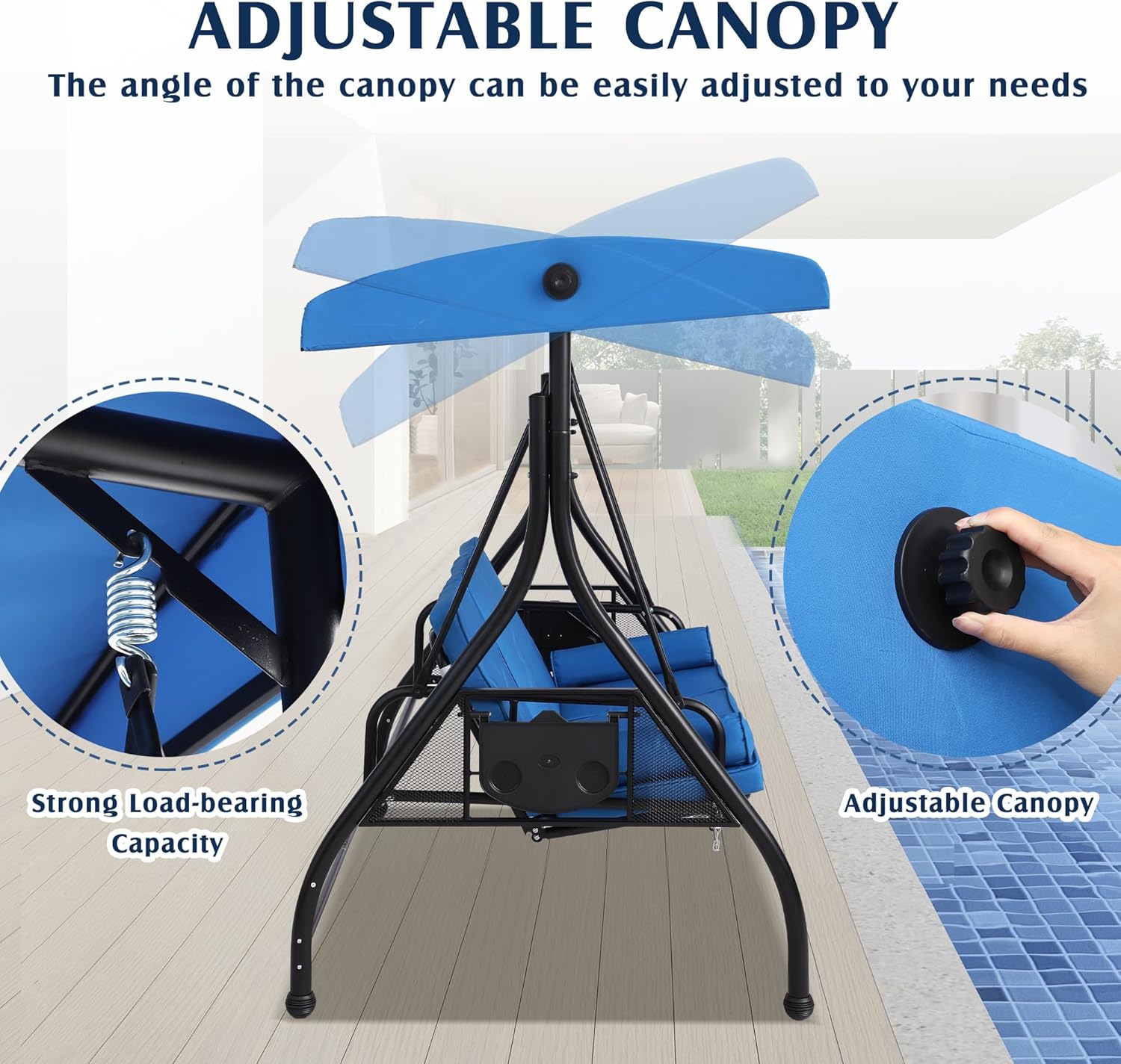 Adjustable Canopy: Patio swing canopy can be set within 45 degrees to adapt to different sunlight directions and provide the best shade. Protect you from ultraviolet rays and drizzle. If you want to sunbathe, just remove the canopy