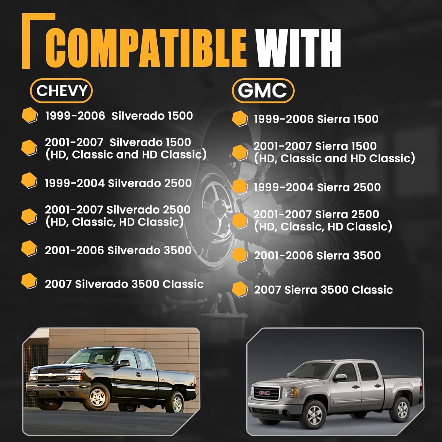【FITS】Fit for Chevrolet 1999-2006 Silverado 1500, 2001-2007 Silverado 1500 (HD, Classic and HD Classic), 1999-2004 Silverado 2500, 2001-2007 Silverado 2500 (HD, Classic, HD Classic), 2001-2006 Silverado 3500, 2007 Silverado 3500 Classic. 丨 GMC 1999-2006 Sierra 1500, 2001-2007 Sierra 1500 (HD, Classic and HD Classic), 1999-2004 Sierra 2500, 2001-2007 Sierra 2500 (HD, Classic, HD Classic), 2001-2006 Sierra 3500, 2007 Sierra 3500 Classic.