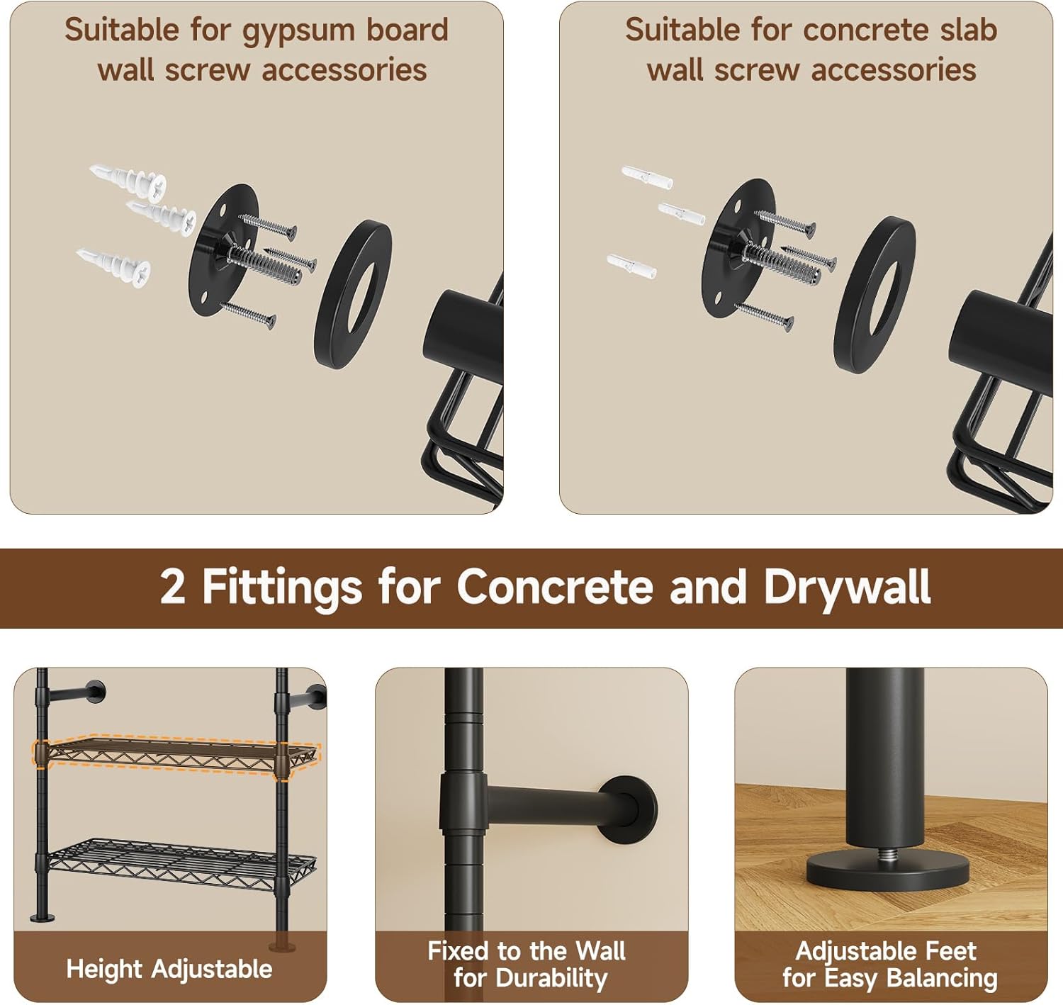 Sturdy & Collapse-Resistant Construction: Built with high quality matte powder coated metal pipes, this clothes rack is sturdy and stable, not easy to deform to ensure durability, and is equipped with a secure wall mounted system that won’t shake or collapse to avoid accidental tipping.