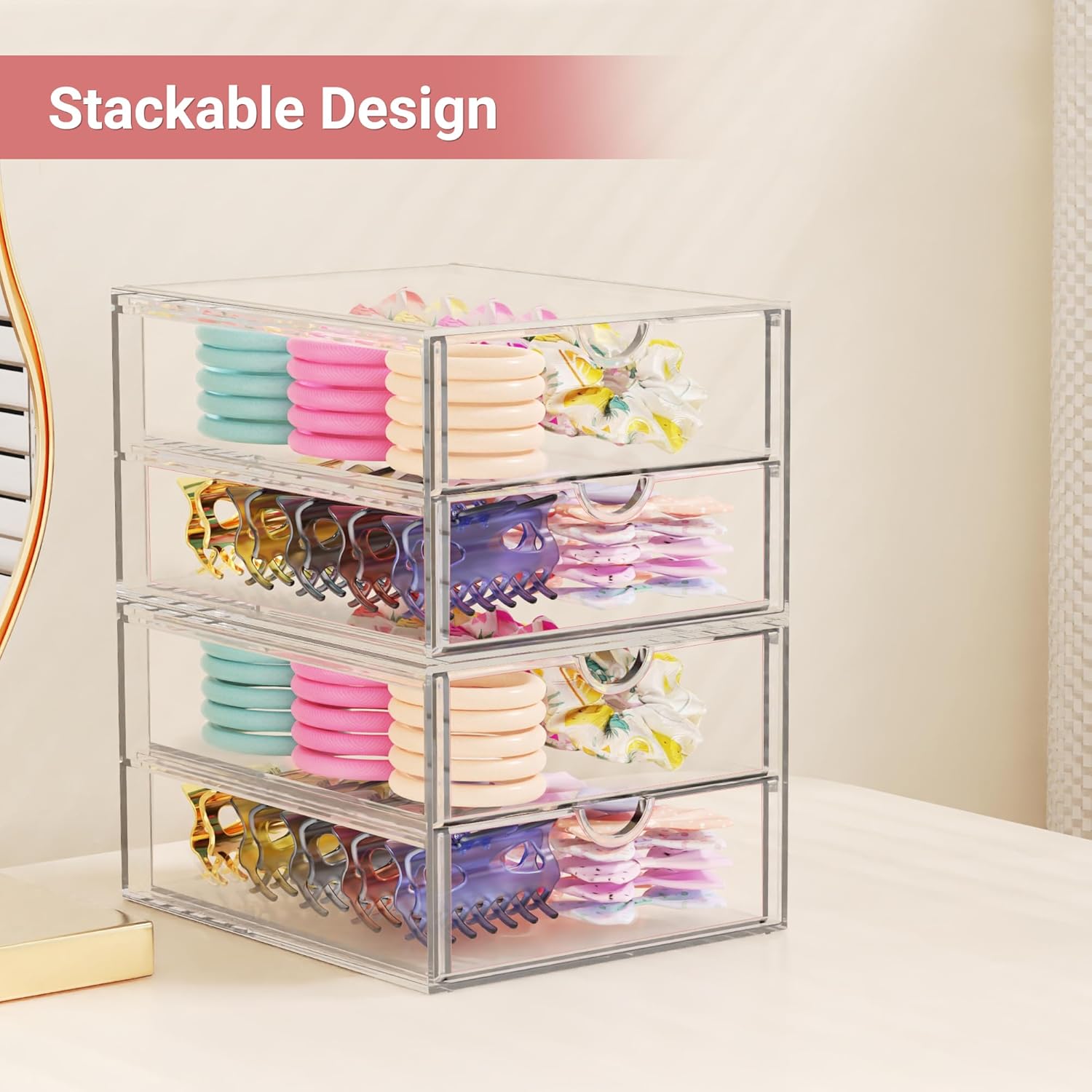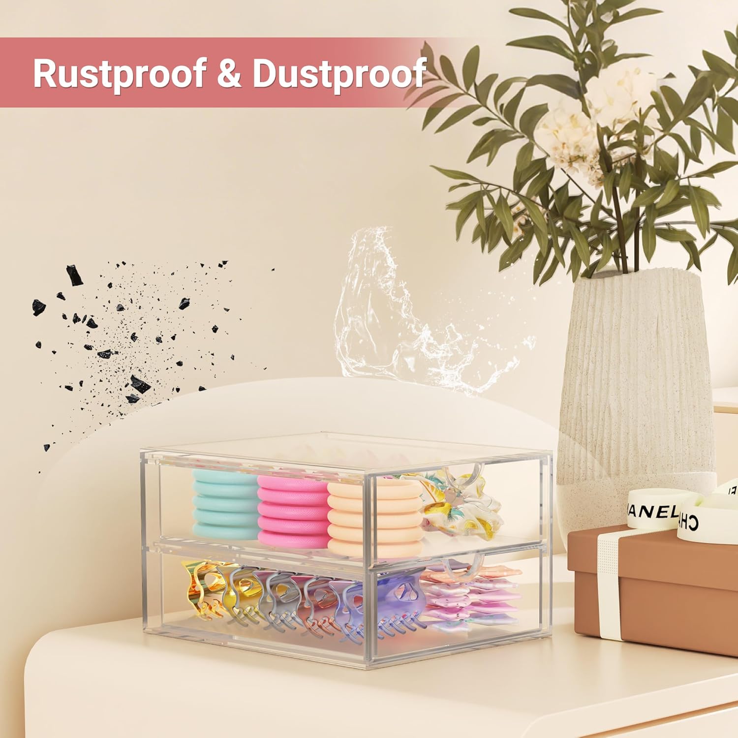 Hair Accessories Organizer for Girls, 2 Tier Acrylic Stackable Storage Drawers, Clear Vanity Hair Tie Bow Claw Clip Scrunchie Holder Organizer for Girls Stuff, Cute Desk Organizers and Accessories