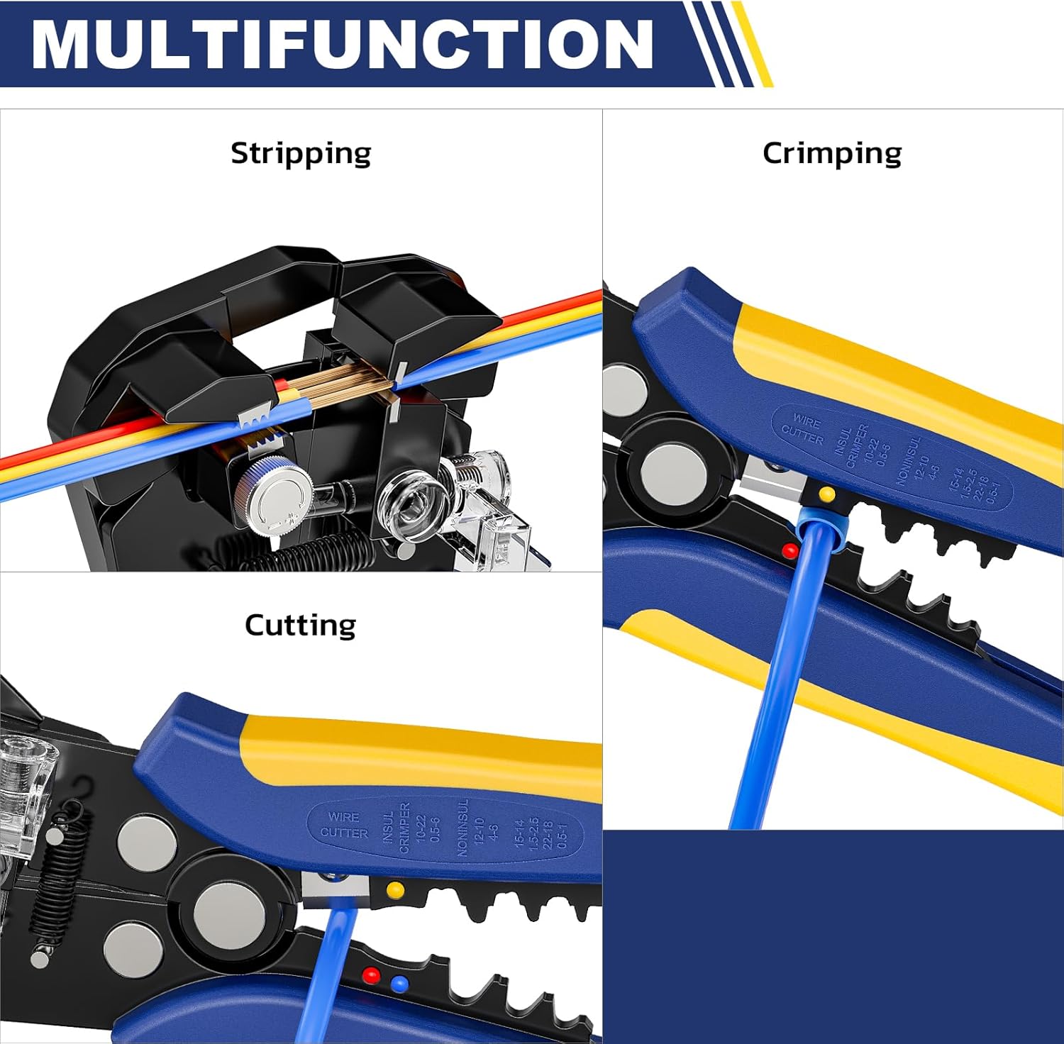 This set includes more jaws than I will ever need, so far I’ve tested it with insulated, heat shrink, and non-insulated crimping jaws, and each ones works fantastic. The adjustable crimp strength is a great feature, and the included automatic wire strippers are very sharp and work flawlessly.